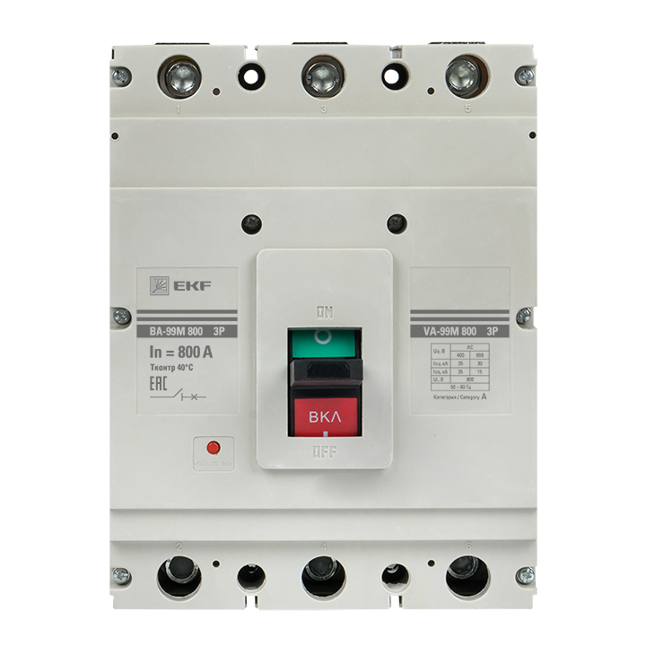 "Выключатель ВА-99М выполнен в виде моноблока и состоит из основания и крышки с фальшпанелью, в которой имеется окно для рукоятки управления и толкатель кнопки «Тест» - проверки механизма отключения выключателя.