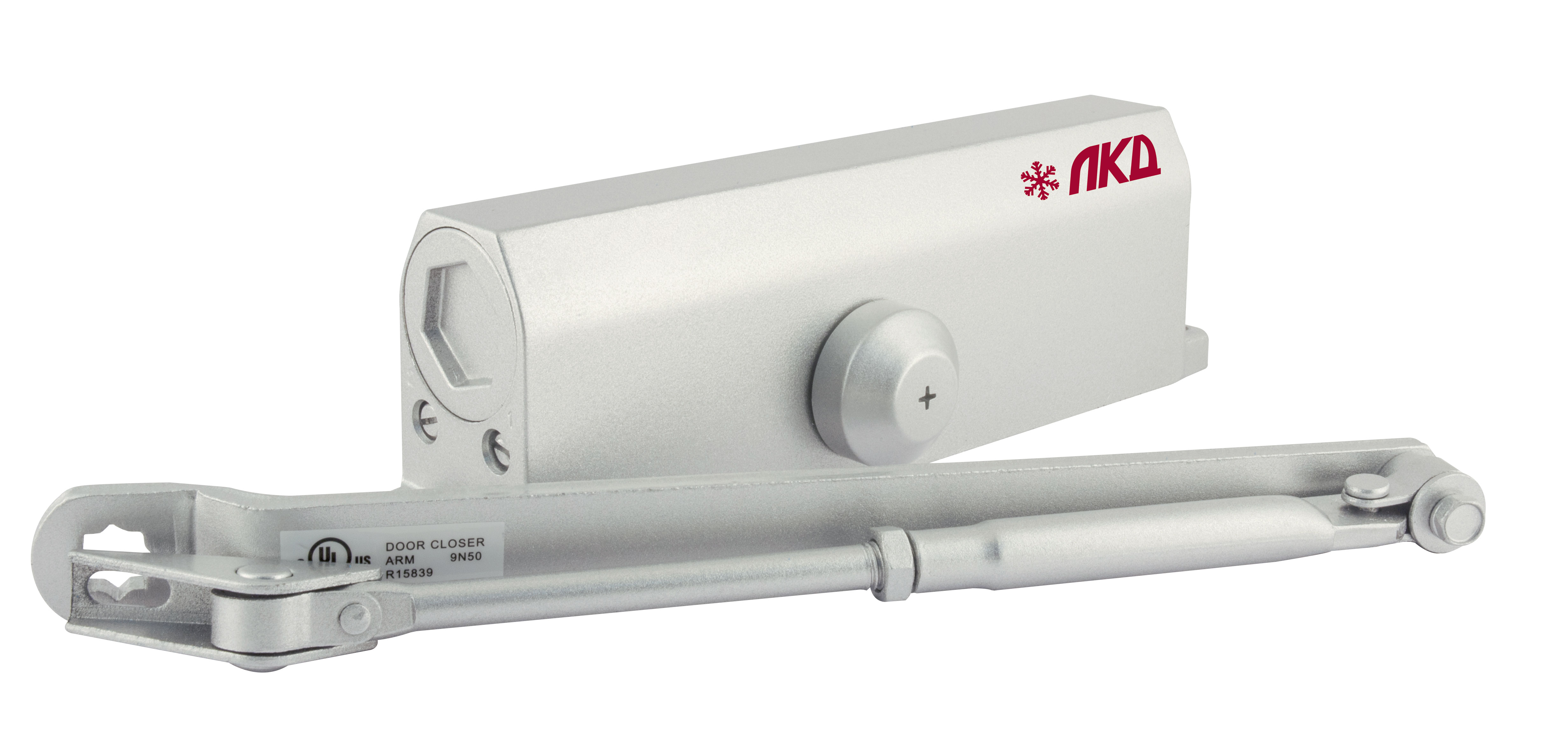 гидравлический, дверной, морозостойкий доводчик. Универсальный по типу установки. Оснащен функцией задержки закрытия. Механизм устанавливается на двери весом 60-110 кг, сделанные из дерева, пластика, металла и других материалов. Применение доводчиков допускается в том числе для противопожарных и противодымных дверей. Тяга и набор крепежа для различных типов дверей поставляется в комплекте.