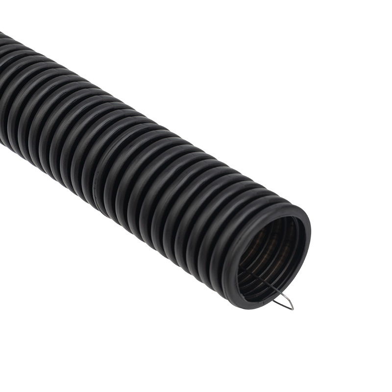 Труба гофрированная из ПНД с зондом, черная Ø 25 мм (бухта 50 м/уп.) REXANT из полиэтилена низкого давления отлично подходит для защиты изолированных проводов и кабелей от механических повреждений и агрессивного воздействия окружающей среды при прокладке сложных систем и трасс. Применяется для скрытой и открытой прокладки в несущих и ограждающих конструкциях из несгораемых материалов жилых, административных и производственных зданий и сооружений.Область применения:- прокладка слаботочных и силовых электросетей, эксплуатируемых при напряжении переменного тока величиной до 1000 В;- прокладка компьютерных, телевизионных, телефонных и IT-сетей и коммуникаций;- использование в огнестойких кабельных линиях.Надежность и безопасность:- высокая коррозионная и химическая стойкость;- повышенная морозостойкость по сравнению с гофрированными трубами из ПВХ и ПП. - труба способна выдерживать отрицательные температуры до -55 ˚С, без изменения своих физико-механических характеристик;- стойкая к ультрафиолету (УФ), устойчива к фотоокислительному старению (эксплуатация на открытом воздухе при воздействии прямых солнечных лучей);- труба способна выдерживать большие механические нагрузки (допускается заливка бетоном);- устойчива к воздействию влаги, которой она может подвергаться в режиме нормальной эксплуатации;- труба обладает соответствующей теплостойкостью.Быстрый и легкий монтаж:- удобство протяжки кабеля обеспечивается наличием зонда (протяжки);- легкость монтажа за счет гибкости и эластичности трубы;- минимальное количество стыков, ввиду большой длины в бухте.Технические характеристики:ПНД полиэтилена низкого давленияСопротивление к жатию, не менее: 350 НПрочность при растяжении до разрыва, не менее: 450 НВнешний диаметр: 25 ±1,0 ммВнутренний диаметр: 18,3 ±1,0 ммТемпература монтажа: -40 ˚С до +90 ˚СТемпература эксплуатации: -55 ˚С до +90 ˚ССтепень защиты: IP55Длина: в бухте 50 м