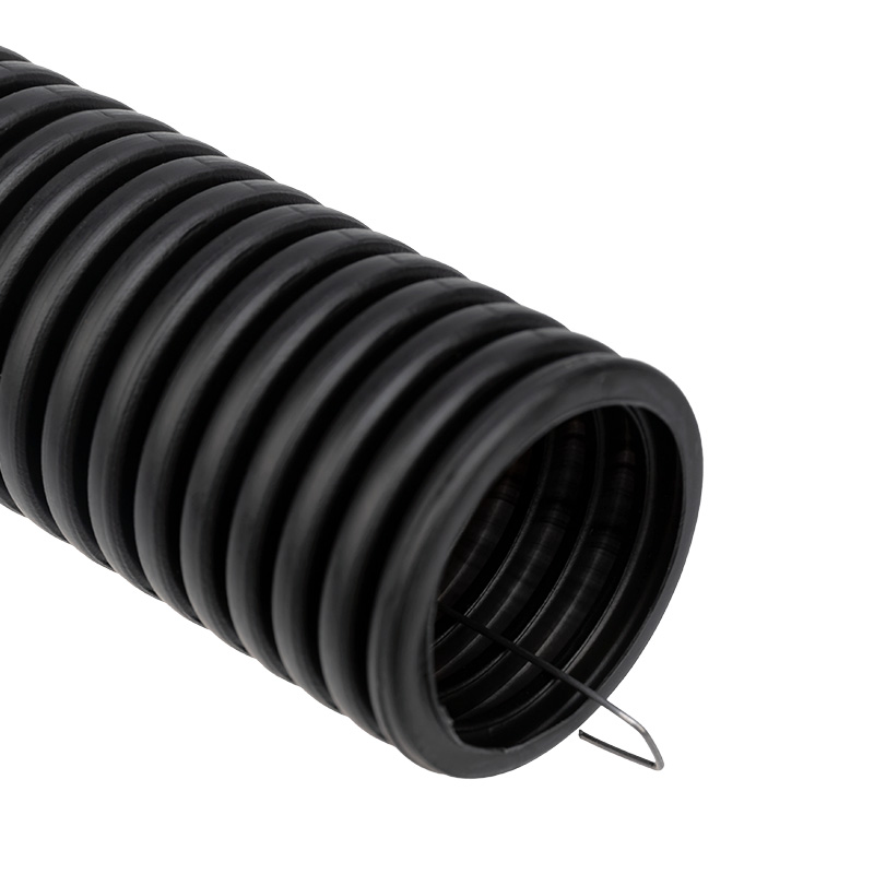 Труба гофрированная из ПНД с зондом, черная Ø 40 мм (бухта 15 м/уп.) REXANT из полиэтилена низкого давления, отлично подходит для защиты изолированных проводов и кабелей от механических повреждений и агрессивного воздействия окружающей среды при прокладке сложных систем и трасс. Применяется для скрытой и открытой прокладки в несущих и ограждающих конструкциях из несгораемых материалов жилых, административных и производственных зданий и сооружений.Область применения:- прокладка слаботочных и силовых электросетей, эксплуатируемых при напряжении переменного тока величиной до 1000 В;- прокладка компьютерных, телевизионных, телефонных и IT-сетей и коммуникаций;- использование в огнестойких кабельных линиях.Надежность и безопасность:- высокая коррозионная и химическая стойкость;- повышенная морозостойкость по сравнению с гофрированными трубами из ПВХ и ПП; - труба способна выдерживать отрицательные температуры до -55 ˚С, без изменения своих физико-механических характеристик;- стойкая к ультрафиолету (УФ), устойчива к фотоокислительному старению (эксплуатация на открытом воздухе при воздействии прямых солнечных лучей);- труба способна выдерживать большие механические нагрузки (допускается заливка бетоном);- устойчива к воздействию влаги, которой она может подвергаться в режиме нормальной эксплуатации;- труба обладает соответствующей теплостойкостью.Быстрый и легкий монтаж:- удобство протяжки кабеля обеспечивается наличием зонда (протяжки);- легкость монтажа за счет гибкости и эластичности трубы;- минимальное количество стыков, ввиду большой длины в бухте.Технические характеристики:ПНД полиэтилена низкого давленияСопротивление к жатию, не менее: 350 НПрочность при растяжении до разрыва, не менее: 750 НВнешний диаметр: 40 ±0,6 ммВнутренний диаметр: 31 ±0,6 ммТемпература монтажа: -40 ˚С до +90 ˚СТемпература эксплуатации: -55 ˚С до +90 ˚ССтепень защиты: IP66Длина: в бухте 15 м