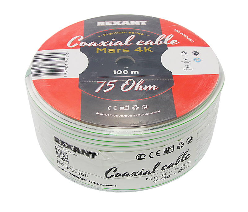 Кабель MARS 4K 75 Ohm REXANT. Состоит из центрального медного провода и металлической оплетки (экрана), разделенных между собой слоем диэлектрика (внутренней изоляции) и имеет общую внешнюю оболочку из морозостойкого ПВХ (PVC). Кабель служит для передачи высокочастотных сигналов и имеет волновое сопротивление 75 Ом. Коаксиальные кабели, предназначенные для работы в СВЧ диапазоне, называются еще радиочастотными кабелями. Область применения кабеля: - Для использования в сетях TV/DVB/DVB-S2/DVB-T2/HD.- Локальные сети общего назначения.- Кабельные сети.- Телевизионные сети.- Цифровое телевидение.- Спутниковое телевидение.- Системы видеонаблюдения.Техническое описание:Материал центрального проводника: бескислородный медный провод, диаметр 1,00 ммФизически вспененный диэлектрик, диаметр: 4,80 мм Экран: двусторонний медный экран и оплётка, состоящая из луженых медных жил 80 х 0,10 ммВнешняя изоляция: ПВХ — поливинилхлорид (PVC) белого цвета с зеленой полосой, толщиной 0,85 ммОбщий диаметр кабеля: 6,8 ммВолновое сопротивление: 75 ОмРабочая температура: –40...+75 °C Упаковка: бухта 100 м/в коробке 4 (четыре) бухтыСрок службы: 30 лет