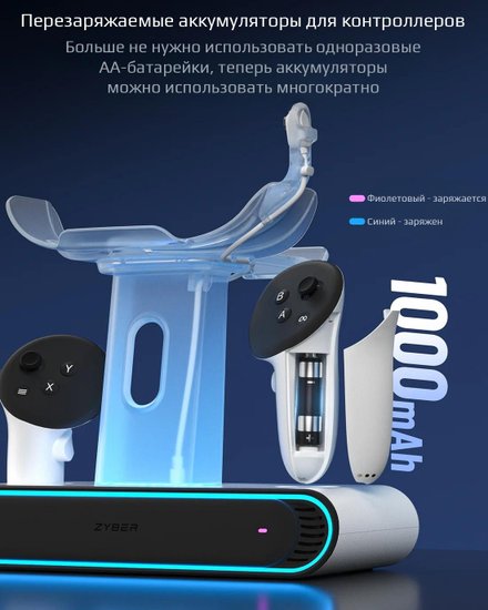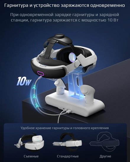 • Комплектация - Крепление держателя гарнитуры- Магнитный коннектор USB-C - 2 шт.- Подставка держателя гарнитуры- Задняя крышка контроллера - 2 шт.- Зарядное устройство Зарядная станция- Кабель USB Type-A - Type-C- Перезаряжаемые аккумуляторы - 2 шт.- Магнитный кабель для зарядки- Держатель гарнитуры- Адаптер