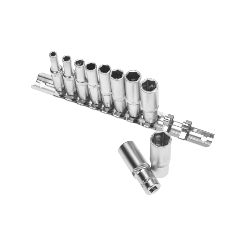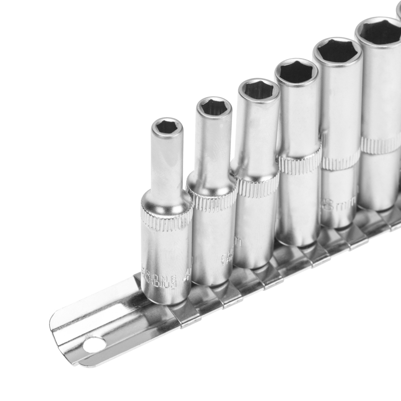Набор головок REXANT используется для монтажа и демонтажа резьбовых соединений. Инструменты изготовлены из хромованадиевой износостойкой и долговечной стали с хромоникелевым покрытием. Твердость материала рабочей части головок – 42 HRС. В набор входят 6-гранные удлиненные торцевые головки на планке под квадрат 1/4" следующих размеров: 4, 5, 6, 7, 8, 9, 10, 11, 12 и 13 мм. Ярко-красная полоска предназначена для удобного поиска. Технические характеристики: Головка торцевая удлиненная, 4 мм: 1 шт. Головка торцевая удлиненная, 5 мм: 1 шт. Головка торцевая удлиненная, 6 мм: 1 шт. Головка торцевая удлиненная, 7 мм: 1 шт. Головка торцевая удлиненная, 8 мм: 1 шт. Головка торцевая удлиненная, 9 мм: 1 шт. Головка торцевая удлиненная, 10 мм: 1 шт. Головка торцевая удлиненная, 11 мм: 1 шт. Головка торцевая удлиненная, 12 мм: 1 шт. Головка торцевая удлиненная, 13 мм: 1 шт. Металлическая плашка-держатель: 1 шт. Количество предметов: 10 Количество граней: 6 Размер присоединительного квадрата: 1/4 дюйм Минимальный размер головки: 4 мм Максимальный размер головки: 19 мм Марка стали: CrV Назначение: для автомобиля Особенности: удлиненная, на держателе