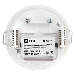 Датчик движения микроволновые предназначены для экономии электроэнергии за счет автоматического управления освещением и другими инженерными системами. Датчики реагирует на движение людей и других объектов в зоне действия сенсора, принцип работы датчиков основан на генерировании высокочастотных электромагнитных волн и детектировании полученного обратного сигнала. Таким образом микроволновые датчики имеют повышенную чувствительность и могут детектировать движение сквозь тонкие преграды (гипсокартон, стекло, подвесной потолок и т.д.).В ассортименте EKF есть датчики, предназначенные для монтажа на стену и потолок накладным или встраиваемым способом. В зависимости от степени защиты датчики можно использовать как в помещении (IP20), так и на улице под навесом (IP44).Рекомендуется использовать ИК датчики в коридорах, подъездах, гардеробных и в других проходных зонах. Алгоритм работы: при возникновении движения в поле зрения датчика встроенное электромеханическое реле коммутирует подключенную нагрузку. После этого нагрузка находится под напряжением в течение заданного времени (время настраивается) и выключается. Дополнительно датчики имеют функцию контроля освещенности. Если освещенность в зоне детекции выше заданного уровня (уровень настраивается), то нагрузка включаться не будет, что позволяет дополнительно экономить электроэнергию в дневное время.