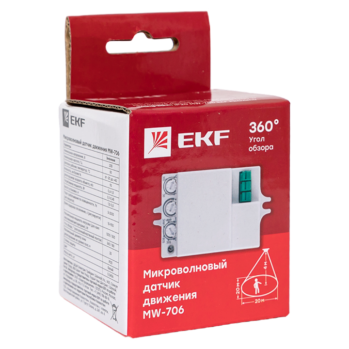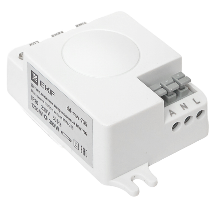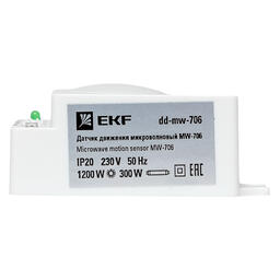 Датчик движения микроволновые предназначены для экономии электроэнергии за счет автоматического управления освещением и другими инженерными системами. Датчики реагирует на движение людей и других объектов в зоне действия сенсора, принцип работы датчиков основан на генерировании высокочастотных электромагнитных волн и детектировании полученного обратного сигнала. Таким образом микроволновые датчики имеют повышенную чувствительность и могут детектировать движение сквозь тонкие преграды (гипсокартон, стекло, подвесной потолок и т.д.).В ассортименте EKF есть датчики, предназначенные для монтажа на стену и потолок накладным или встраиваемым способом. В зависимости от степени защиты датчики можно использовать как в помещении (IP20), так и на улице под навесом (IP44).Рекомендуется использовать ИК датчики в коридорах, подъездах, гардеробных и в других проходных зонах. Алгоритм работы: при возникновении движения в поле зрения датчика встроенное электромеханическое реле коммутирует подключенную нагрузку. После этого нагрузка находится под напряжением в течение заданного времени (время настраивается) и выключается. Дополнительно датчики имеют функцию контроля освещенности. Если освещенность в зоне детекции выше заданного уровня (уровень настраивается), то нагрузка включаться не будет, что позволяет дополнительно экономить электроэнергию в дневное время.