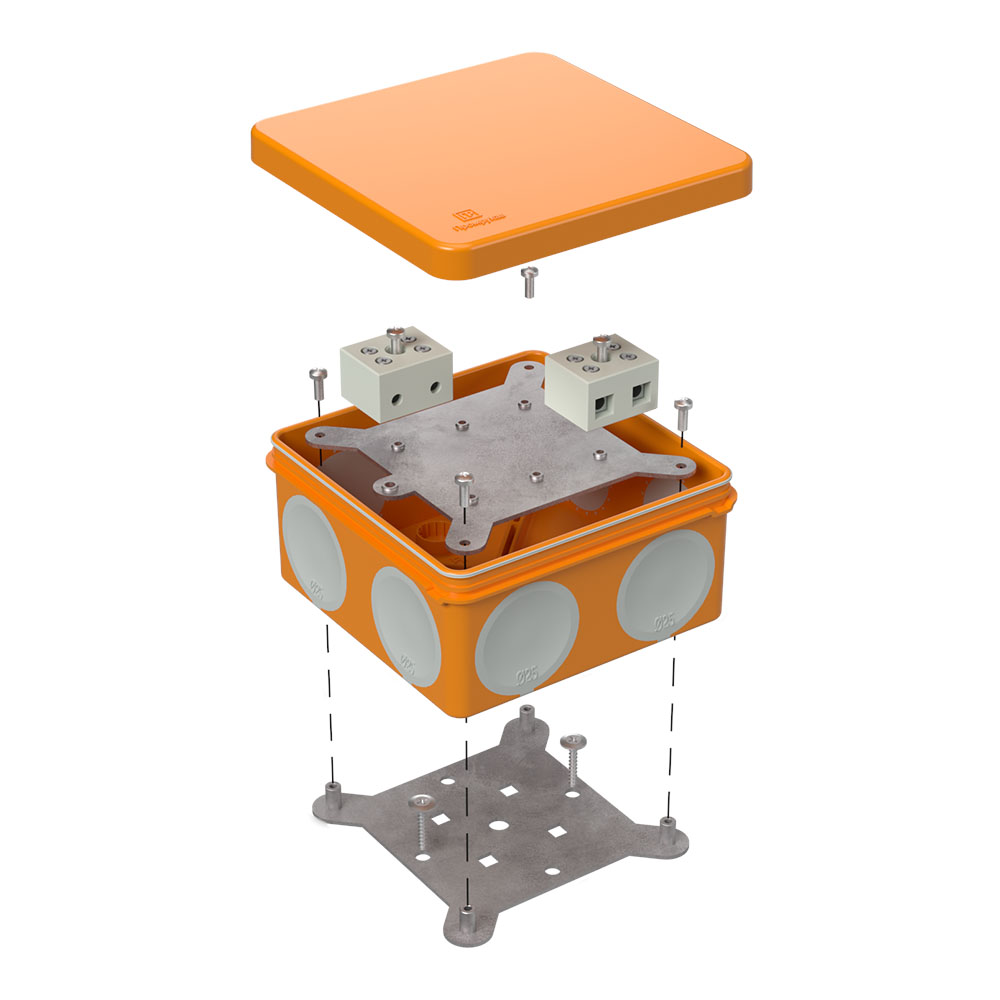 ЭМК двухкомпонентные огнестойкие сочетают в себе надежность и высокую скорость монтажа. Они применяются при прокладке систем противопожарной безопасности по различным поверхностям зданий и сооружений, необходимы для механической защиты мест соединения проводов и кабелей, а так же для защиты от проникновения пыли, влаги и посторонних предметов. Лаконичный дизайн способствует эстетичному монтажу проводки, а мембраны позволяют увеличить скорость монтажа (по сравнению со скоростью при использовании ЭМК с гермовводами). Материал изготовления коробок является безгалогенным, что позволяет использовать изделие в общественных местах с высоким скоплением людей. Коробка имеет монолитное исполнение с уплотнителем и мембранами за счёт чего достигается высокая степень защиты IP66.