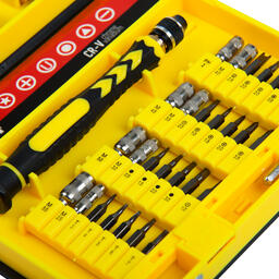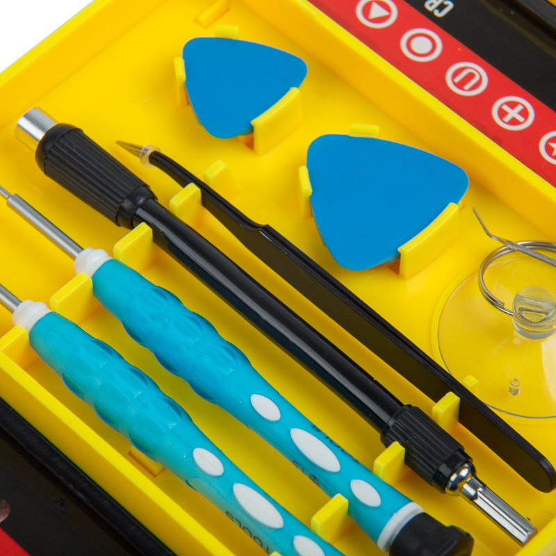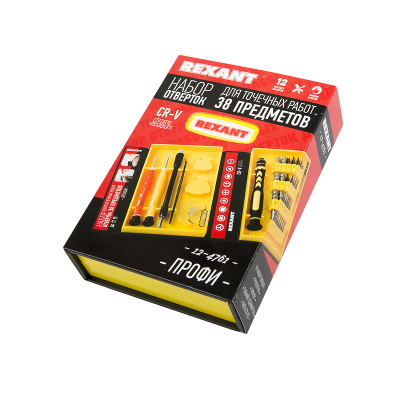 Набор для точечных работ 38 предметов Профи REXANT предназначен для выполнения прецизионных работ в электронике и электромеханике. Прекрасно подойдет для ремонта мобильных телефонов, планшетов, электронных книг, часов, ноутбуков, MacBook, iPhone и др.Биты набора выполнены из хромованадиевой стали. Эргономичная двухкомпонентная рукоятка отвертки делает работу с инструментом легкой и удобной. Цанговый зажим обеспечивает быструю заменуи надежную фиксацию насадок.Набор поставляется в пластиковом прорезиненном футляре и содержит 38 предметов:2 отвертки специального назначения: iPhone, Android; 2 пластиковых медиатора, для вскрытия корпусов/экранов Присоска для снятия экранаБулавка для открытия слотов сим/карт памятиГибкий удлинительПинцетУдлинительОтвертка Биты и головки 28 шт Головки: PH2, М2.5, М3, М3.5, М4, М4.5, М5, М5.5Биты:Т3, Т4, Т5, Т6, Т7H 0.9, H 1.5, H 2.0, H 3.0SL 1.0, SL 2.0PH1, PH1.5, PHPH2, PH3,5U2.6▲ 2.0Υ 2.0ʘ 0,8Pentalobe 0,8