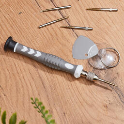 Набор для точечных работ 8 предметов REXANT предназначен для выполнения прецизионных работ в электронике и электромеханике.Биты набора выполнены из хромованадиевой стали. Магнитный держатель обеспечивает быструю замену и надежную фиксацию насадок.Набор содержит 8 предметов:PHILLIPS (крестовая): PH1.2, PH1.5 mmPentalobe (шлиц для продукции Apple): 0.8TORX (шестигранная звезда): T2, T5ОтверткаМедиатор (для снятия корпуса, извлечения деталей и схем)Присоска (для снятия экрана)Подходит для ремонта большинства видов и моделей популярной портативной техники: смартфоны, часы, планшетные ПК, игровые приставки, электронные сигареты, ремонта iPhone (iPhone 4, 4s, 5, 5S, 5C, SE, 6, 6 plus), iPAD, iPod. Характеристики:Надежный цанговый зажимДлина стержней: 40 ммНамагниченные наконечники Вращающаяся шляпкаПротивоскользящая рукоятка