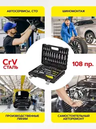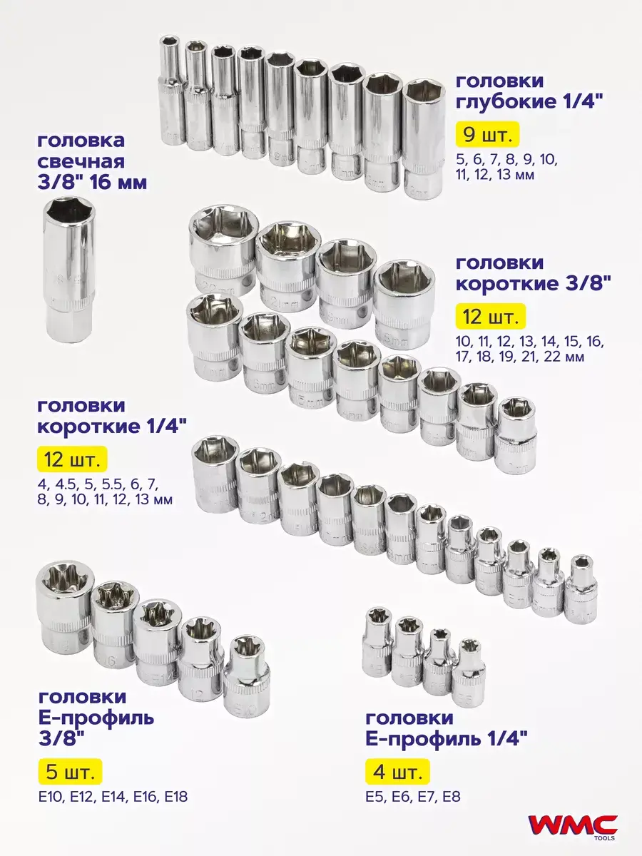 • Головки торцевые (24 шт.), глубокие торцевые (9 шт.), торцевые Е-тип (9 шт.), свечные (1 шт.), головки со вставкой (18 шт.)