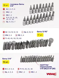 • Насадки-биты шлицевые (SL) (SL4, SL5, SL6, SL8, SL10, SL12), крестовые (PH) (РН1, РН2, РН3, РН4), крестовые с насечками (PZ) (PZ1, PZ2, PZ3, PZ4), шестигранные (Hex) (Н3, Н4, Н5, Н6, Н7, Н8, Н10, Н12, Н14), звездочкой (Torx) (Т10, Т20, Т25, Т30, Т40, Т45, Т50, Т55, Т60)
