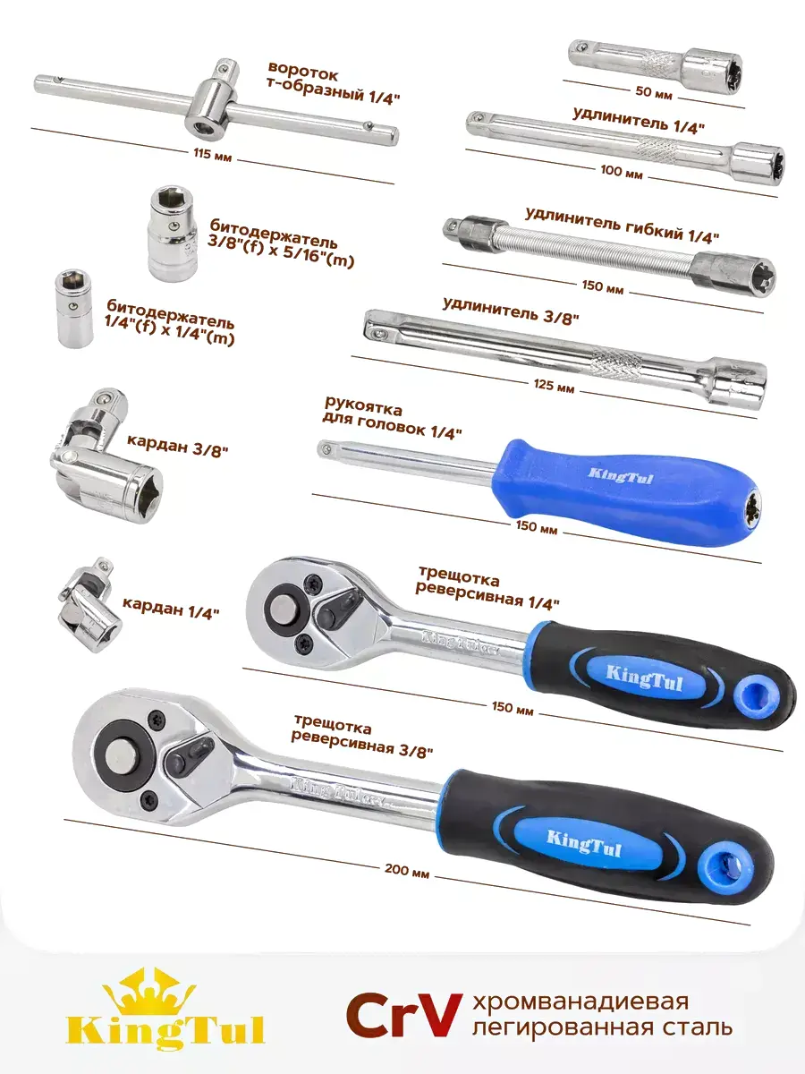 • Удлинители 3/8″ (125 мм), 1/4″ (50, 100 мм), гибкий удлинитель