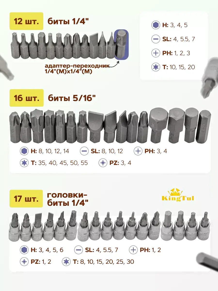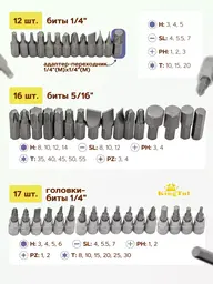 • Насадки-биты шлицевые (SL) (SL4, SL5.5, SL7, SL8, SL10, SL12), крестовые (PH) (РН1, РН2, РН3, РН4), крестовые с насечками (PZ) (PZ3, PZ4), шестигранные (Hex) (Н3, Н4, Н5, Н8, Н10, Н12, Н14), звездочкой (Torx) (Т10, Т15, Т20, Т35, Т40, Т45, Т50, Т55)