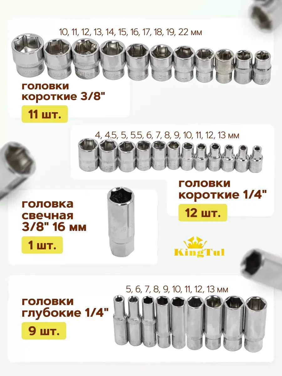 • Торцевые головки 3/8" (10, 11, 12, 13, 14, 15, 16, 17, 18, 19, 22 мм), 1/4" (4, 4.5, 5, 5.5, 6, 7, 8, 9, 10, 11, 12, 13 мм)