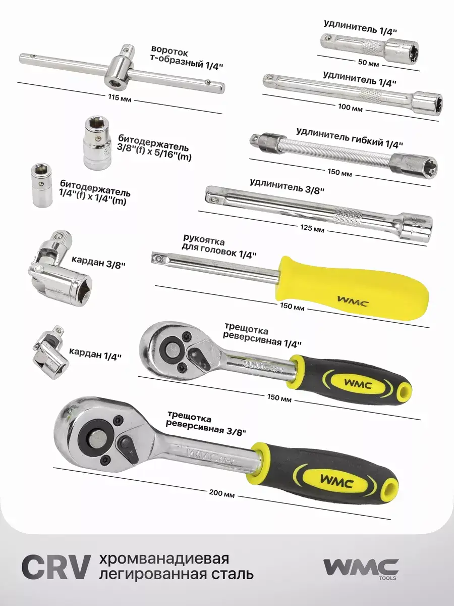 • Удлинители 3/8″ (125 мм), 1/4″ (50, 100 мм), гибкий удлинитель