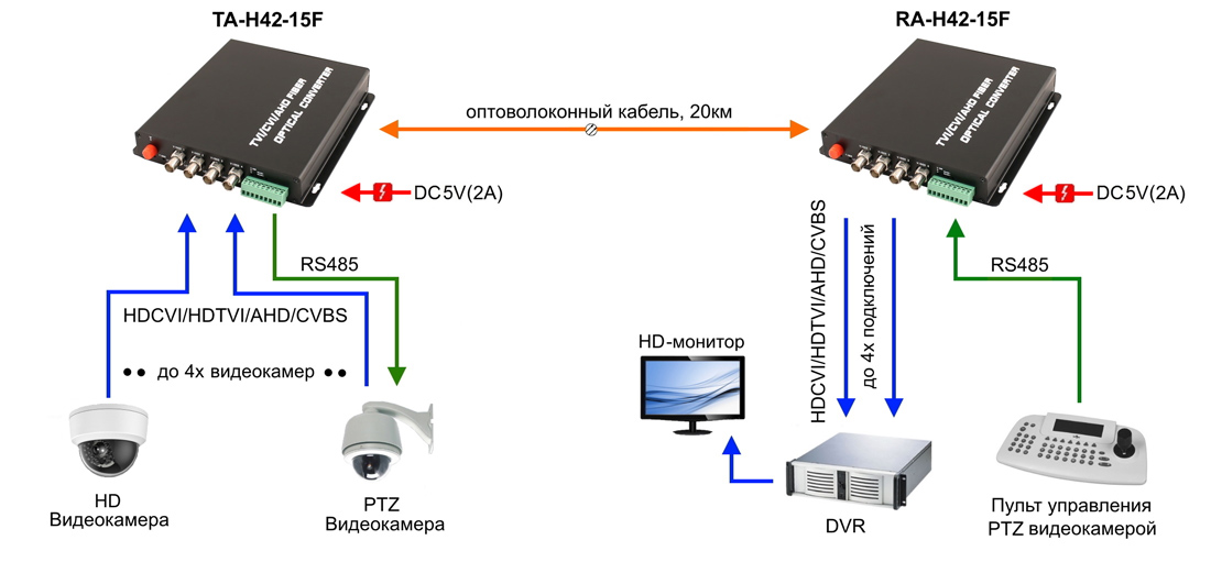 Оптический приемник 4 каналов видео HDCVI/HDTVI/AHD/CVBS и 1 двунаправленного канала управления (RS485/полудуплекс) по одномодовому оптоволокну до 20км. Максимальное разрешение 2560x1920. Рабочие длины волн WDM: 1310нм/1550нм. Вх. - FC/Роз.5,5мм(DC5V). Вых. - BNCх4/Клемм.колодка(RS485). Размеры (ШxВxГ): 167*28*173мм. Вес:0,8 кг. Рабочая температура: -15…+60°С.