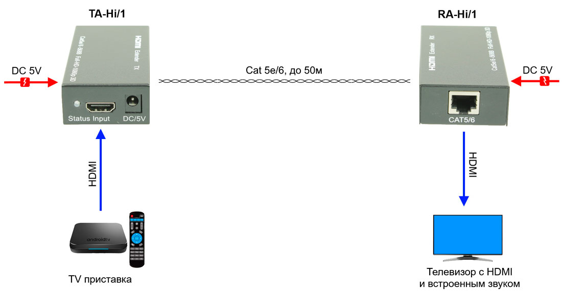 Комплект для передачи HDMI по одному кабелю витой пары CAT5e/6 до 50м. Разрешение до 1080p, 36бит(Deep Color). Поддержка 3D и HDCP. Скорость передачи данных до 6,75Гбит/с. Функция копирования EDID. Передатчик: Вх. - HDMI(A)/Роз.2,1х5мм(DC5V). Вых. - RJ45. Приёмник: Вх. - RJ45/Роз.2,1х5мм(DC5V). Вых. - HDMI(A). В комплекте БП DC5V(1А) - 2шт. Размеры каждого устройства (ШxВxГ): 48x25x83мм. Вес комплекта: 0,22кг. Рабочая температура: -15…+55°С.