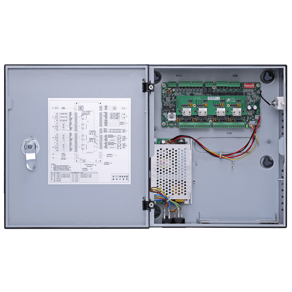 4 считывателя (карты, пароли, отпечатки пальцев); Интерфейс считывателей Wiegand или RS-485; TCP/IP протокол; Тревожные вх/вых: 4/4; Защита от двойного прохода, мультидверная взаимоблокировка, мульти-карточная верификация (доступ по нескольким картам); Встроенный источник питания; Поддерживает АКБ
