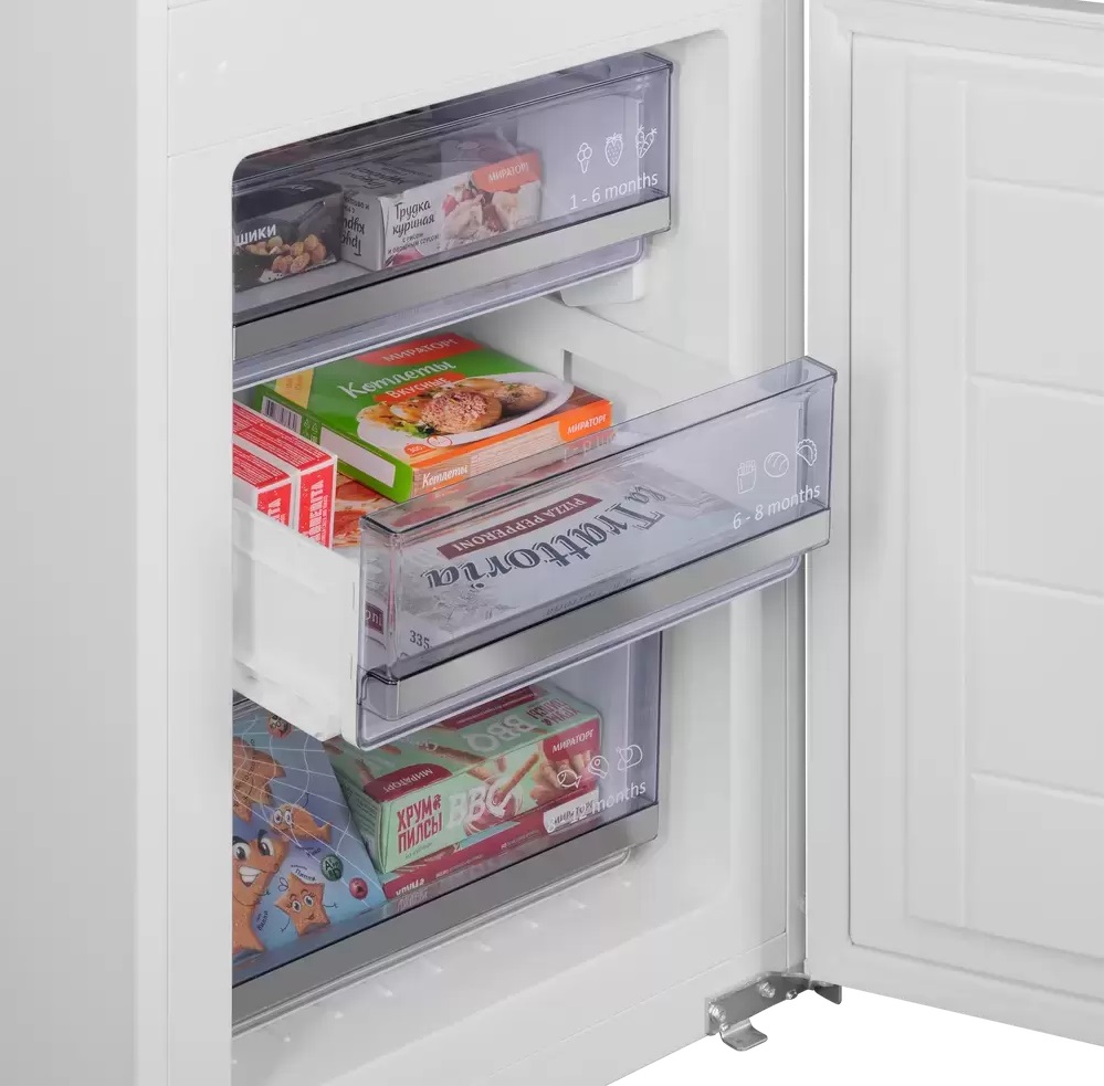Встраиваемый прибор проще разместить в комнате, даже если общий метраж не такой уж большой. Вы можете спрятать его за декоративной панелью от мебельного фасада — советуем заранее определить нишу и заказывать панели исходя из типа крепления к двери. Способ монтажа в данной модели: скользящее крепление двери (система door sliding) Вы можете поменять направление открывания двери, так как упор переставляемый и ее можно перевесить на другую сторону. Такая функция открывает больше возможностей для установки. Холодильник с морозильником обладает всеми опциями, которые чаще всего ищут и выбирают покупатели. Стандартная конфигурация — универсальный вариант для любой квартиры. Количество камер: 2.