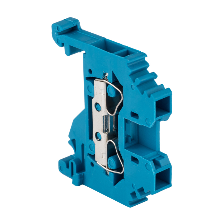 Особое преимущество данных клемм – в безвинтовом креплении проводников: используются подпружиненные самозажимные контакты. Подвод проводника осуществляется сбоку клеммы. Для отсоединения проводника необходимонажать отверткой на пружину через отверстие, расположенное сверху клеммы. Рассчитаны на применение в цепях переменного тока с напряжением до 800 В и частотой 50 Гц. Клеммы изготавливаются из огнестойкого полиамида следующих цветов: серый, синий, желто-зеленый (земля). Дополнительно к клеммам выпускаются боковые заглушки для закрытия контактов конечной клеммы, перемычки для разветвления проводников и др."