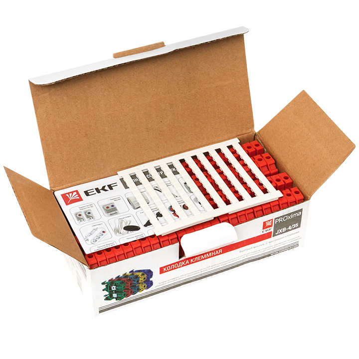 "Колодки клеммные JXB EKF PROxima и EK-JXB (земля) устанавливаются на DIN-рейку в распределительных щитах для надежного и удобного подключения проводников различных сечений и разного назначения. Зажим проводника осуществляется винтом. Рассчитаны на применение в цепях переменного тока с частотой 50 Гц. Изготовлены из цветного пожаростойкого полиамида.