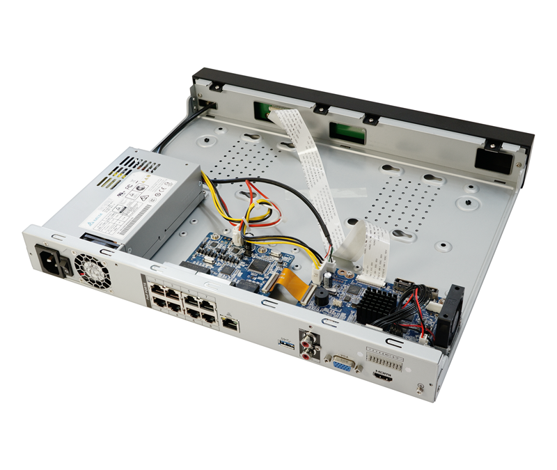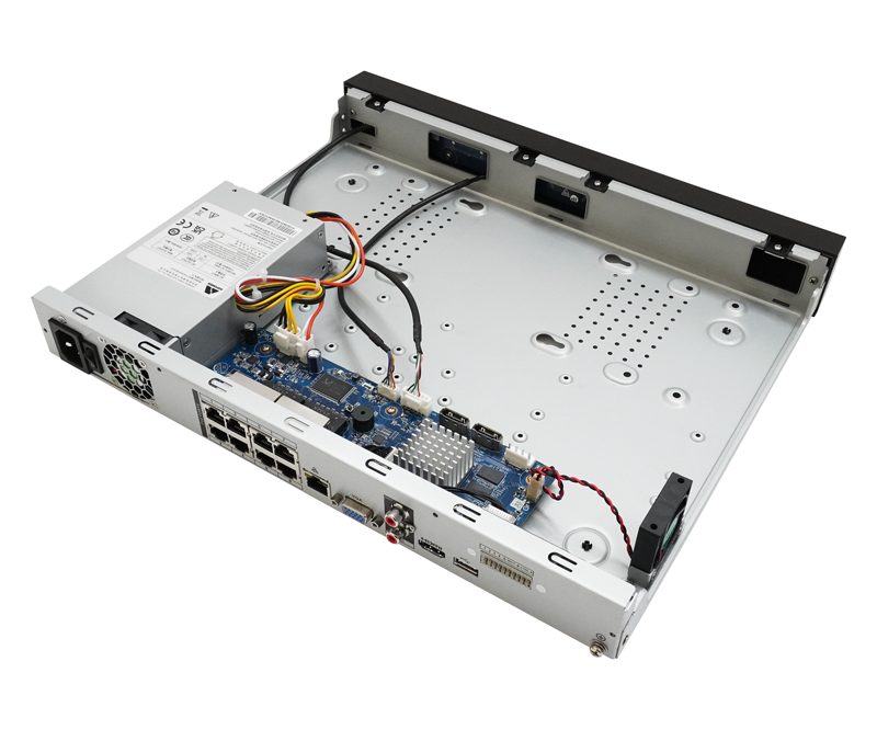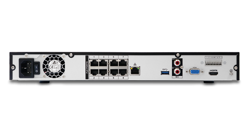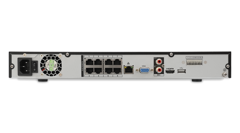 • До восьми сетевых видеокамер • Запись видеоизображения с разрешением до 8 мп • Встроенный адаптер PoE для питания 8 видеокамер по кабелю сети Ethernet • Кодек Н.265 • Скорость записи до 200 Мбит/c • Поддержка двух встраиваемых жестких дисков емкостью до 6 Тб каждый