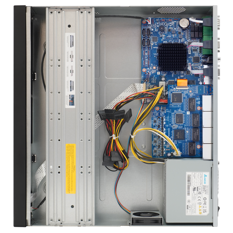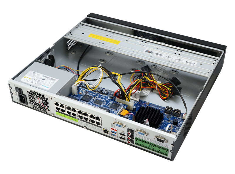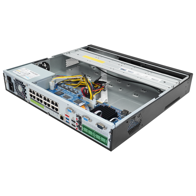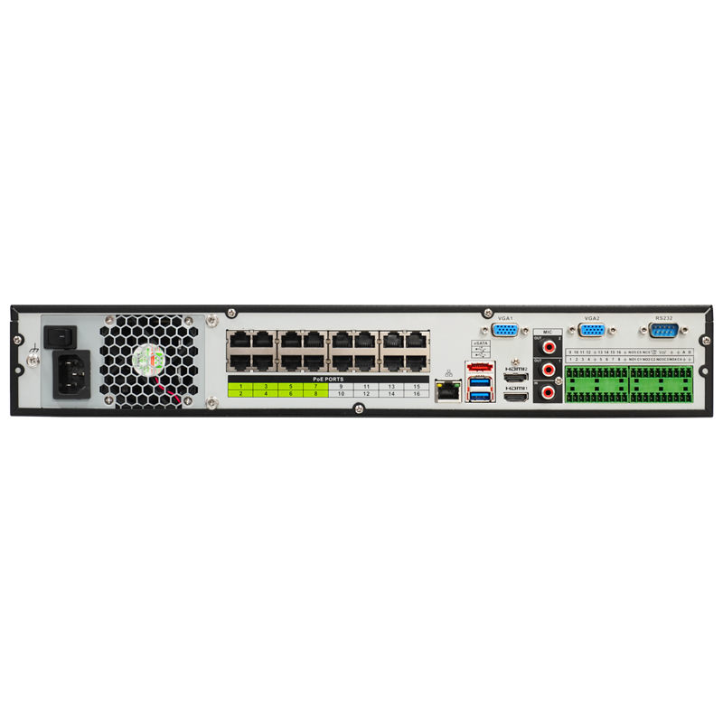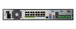 • До шестнадцати сетевых видеокамер • Запись видеоизображения с разрешением до 12 мп • Встроенный адаптер PoE для питания 16 видеокамер по кабелю сети Ethernet • Кодек Н.265 • Скорость записи до 320 Мбит/c • Поддержка четырех встраиваемых жестких дисков емкостью до 8 Тб каждый