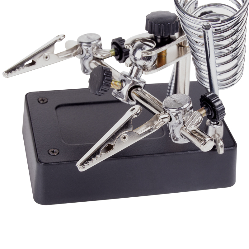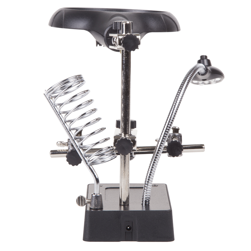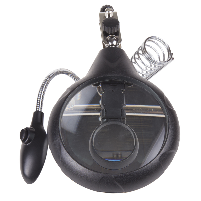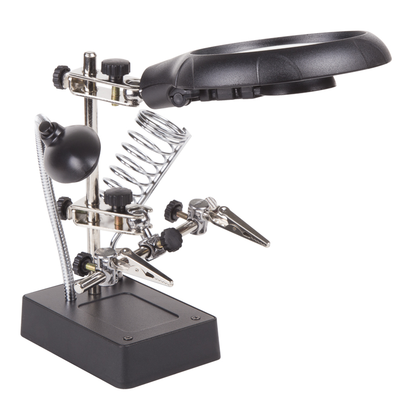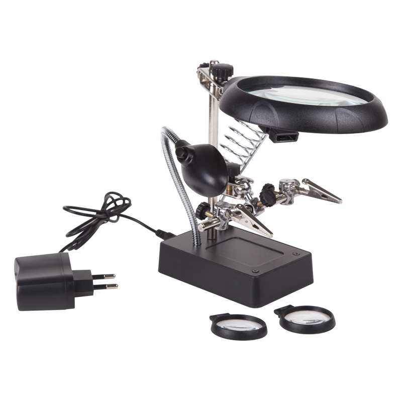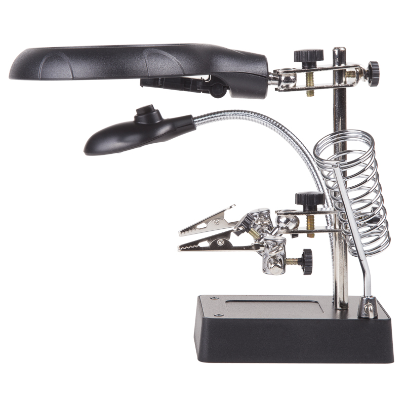 Держатель «третья рука» с лупой х2.5 + х7.5, подставка под паяльник, LED подсветка служит главным образом при проведении паяльно-сборочных работ в электронике, ювелирном деле, сборке и ремонте для зажима мелких деталей в любом нужном положении, когда не хватает двух рук. Инструмент состоит из основания (подставка), шарнирного соединения с зажимами типа «крокодил» (подвижных во всех плоскостях, с никелевым покрытием), трёх луп с кратностью увеличения 2.5x (диаметр 90 мм), 7.5x (диаметр 34 мм) и 10x (диаметр 34мм), а также модуля подсветки. В данной модели реализована подсветка от двух альтернативных источников: 3 батарейки типа АА (не поставляются в комплекте) и блока питания (в комплекте). С помощью лупы можно будет рассмотреть даже самые мелкие детали.Размер в упаковке: 170 x 117 x 93 mmРазмер товара без упаковки в раскрытом виде: 245 x 198 x 120 mm