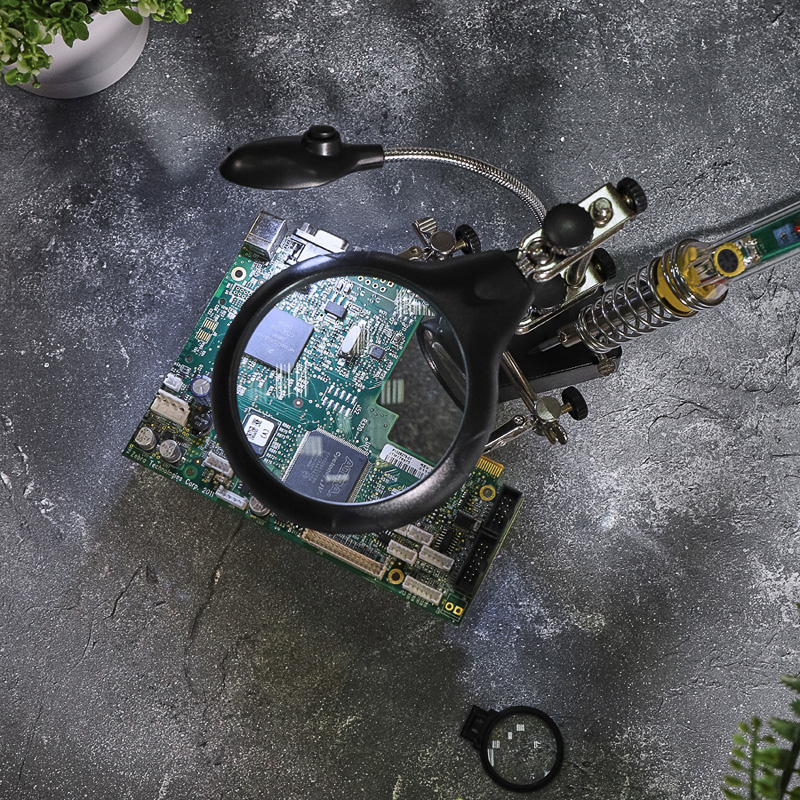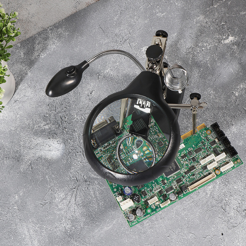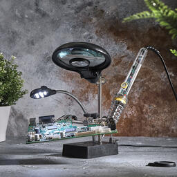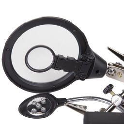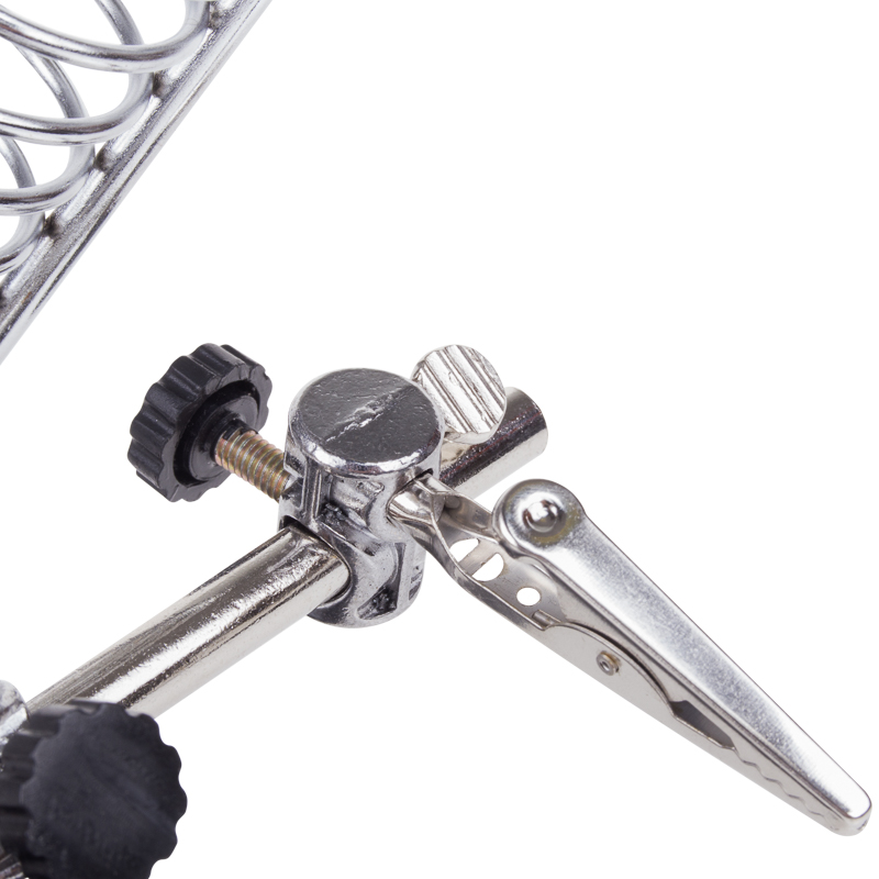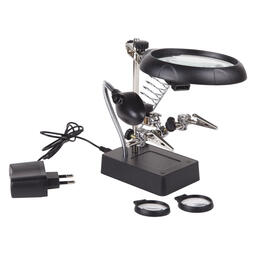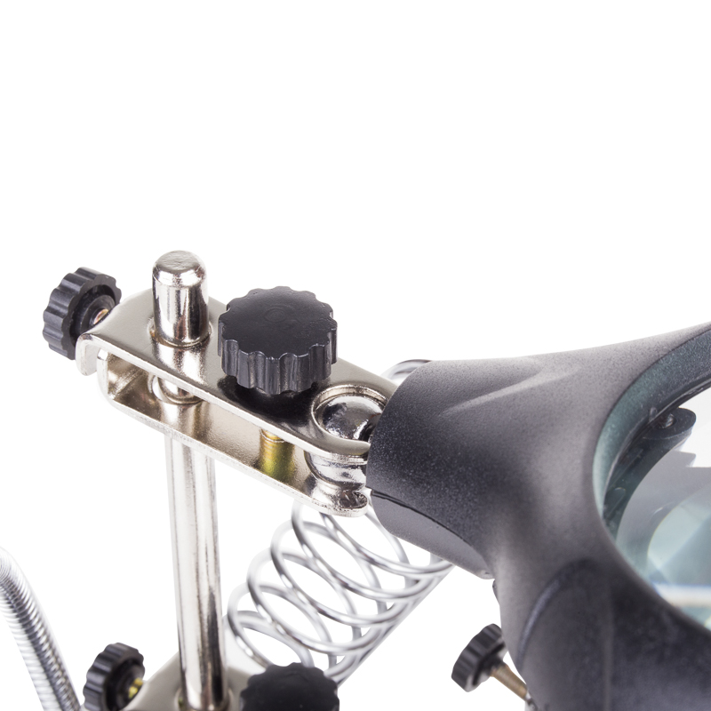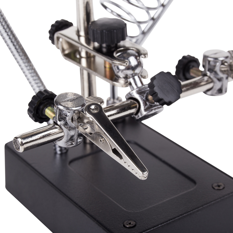 Держатель «третья рука» с лупой х2.5 + х7.5, подставка под паяльник, LED подсветка служит главным образом при проведении паяльно-сборочных работ в электронике, ювелирном деле, сборке и ремонте для зажима мелких деталей в любом нужном положении, когда не хватает двух рук. Инструмент состоит из основания (подставка), шарнирного соединения с зажимами типа «крокодил» (подвижных во всех плоскостях, с никелевым покрытием), трёх луп с кратностью увеличения 2.5x (диаметр 90 мм), 7.5x (диаметр 34 мм) и 10x (диаметр 34мм), а также модуля подсветки. В данной модели реализована подсветка от двух альтернативных источников: 3 батарейки типа АА (не поставляются в комплекте) и блока питания (в комплекте). С помощью лупы можно будет рассмотреть даже самые мелкие детали.Размер в упаковке: 170 x 117 x 93 mmРазмер товара без упаковки в раскрытом виде: 245 x 198 x 120 mm