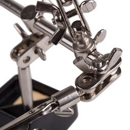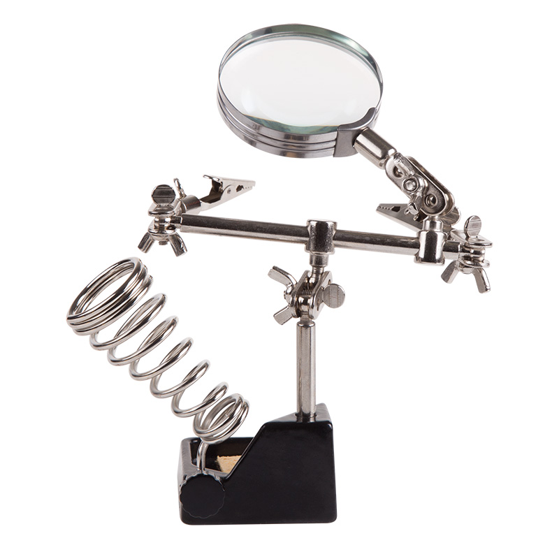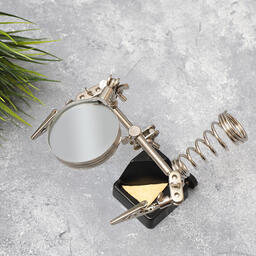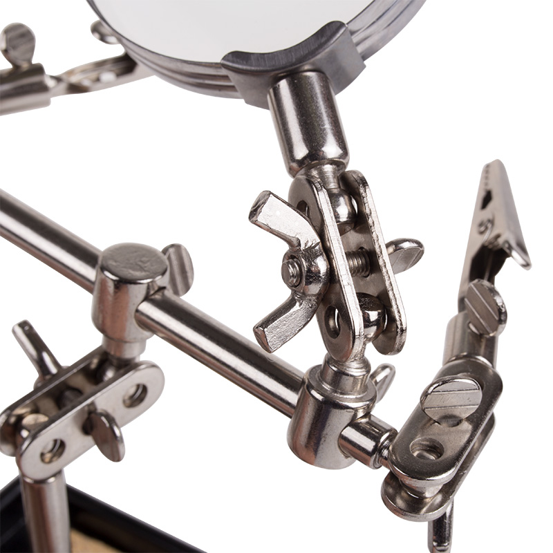 Держатель «третья рука» с лупой х2.5 REXANT служит главным образом при проведении паяльно-сборочных работ в электронике, ювелирном деле, сборке и ремонте для зажима мелких деталей в любом нужном положении, когда не хватает двух рук. Инструмент состоит из чугунного основания (тяжелая подставка с нишей для губки, мелких деталей или припоя), шарнирного соединения с зажимами типа «крокодил» (подвижных во всех плоскостях) с никелевым покрытием, лупы с 2.5-кратным увеличением (возможность регулировки положения, диаметр линзы 60 мм) и спиралевидной подставки под паяльник. С помощью лупы можно будет рассмотреть даже самые мелкие детали.