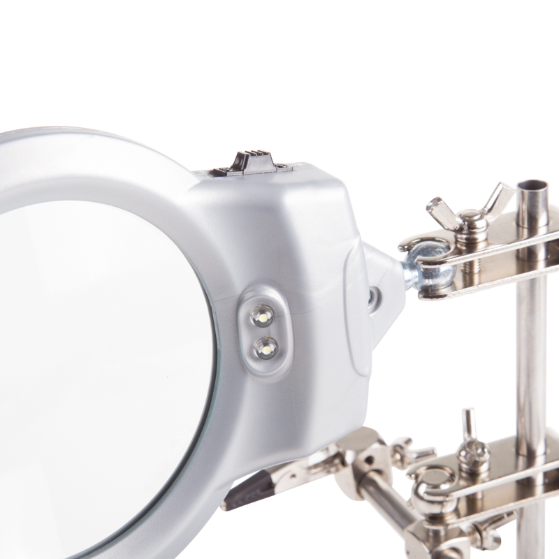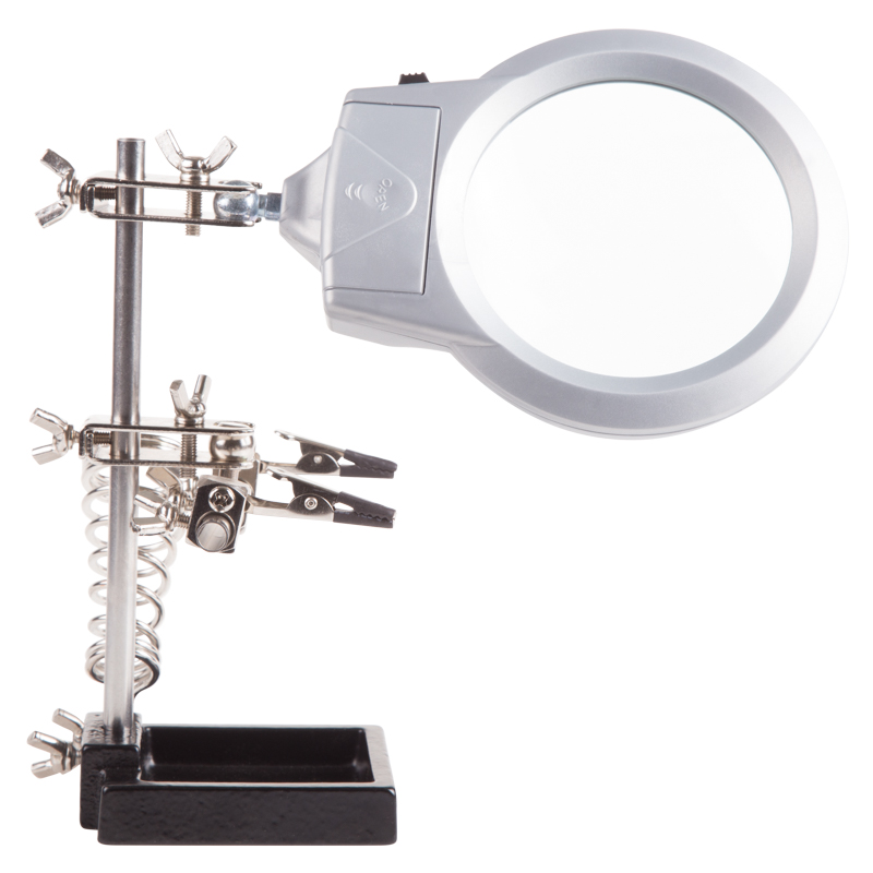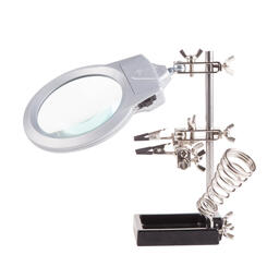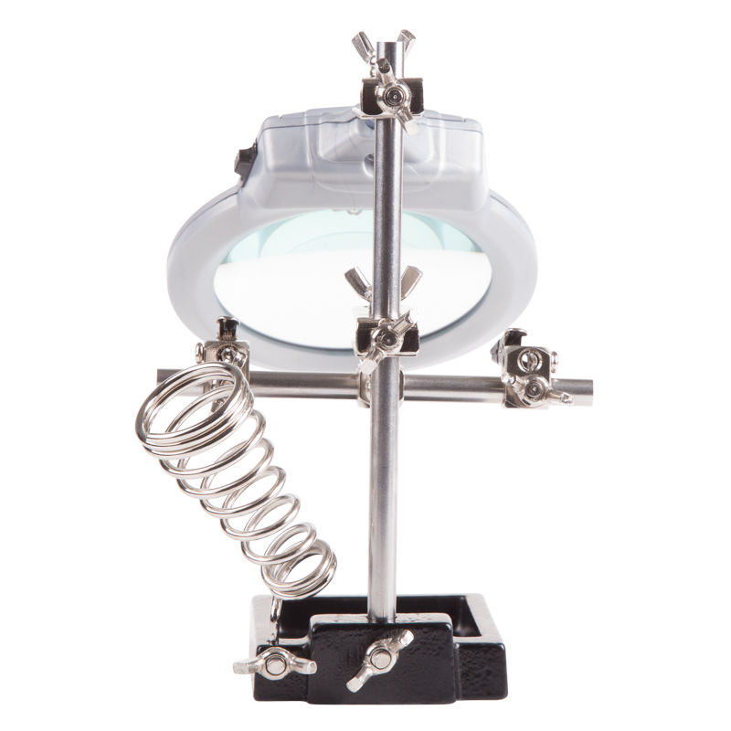 Держатель «третья рука» с подставкой под паяльник и лупой х2.5 с LED подсветкой REXANT служит главным образом при проведении паяльно-сборочных работ в электронике, ювелирном деле, сборке и ремонте для зажима мелких деталей в любом нужном положении, когда не хватает двух рук.Инструмент состоит из чугунного основания (тяжелая подставка с нишей для мелких деталей или припоя), двух подвижных зажимов типа «крокодил» с никелевым покрытием, лупы х2.5 со светодиодной подсветкой (возможность регулировки положения, диаметр линзы 85 мм) и спиралевидной подставки под паяльник с никелевым покрытием. LED подсветка интегрирована в держатель линзы и дает возможность работать в помещениях с плохой освещенностью (питание от ААА х 3 шт.). С помощью лупы можно будет рассмотреть даже самые мелкие детали.