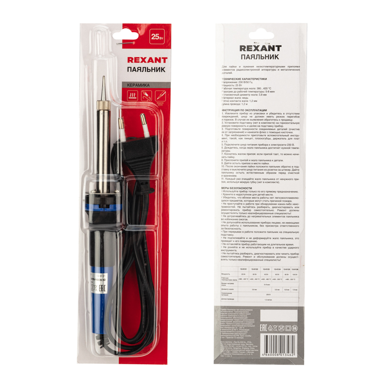 Паяльник с керамическим нагревателем, долговечное жало 25 Вт REXANT предназначен для ручного монтажа радиоэлементов. Его можно использовать как в домашних условиях, так и в профессиональных лабораториях. Паяльник выполнен с керамическим нагревательным элементом, поэтому нагревается быстрее чем, нихромовый и при бережном отношении прослужит много лет. Долговечное жало паяльника состоит из медного сердечника, покрытого слоем электролитически осажденного железа. Рабочая часть жала электрохимически покрыта слоем олова (что обеспечивает облуживаемость), а остальная поверхность — хромирована. Такие жала могут при соблюдении ряда предосторожностей работать длительное время без разрушения. Напряжение питания: 220-230 В 50/60 Гц Потребляемая мощность: 25 ВтРабочая температура жала: 360 °СДлина провода: 1,35 м Удобная эргономичная рукоятка выполнена из термостойкого пластика и с резиновой накладкой, она сделает работу с инструментом легкой и приятной.