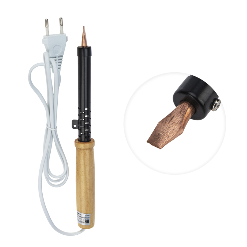 Электрический паяльник со спиральным нагревателем (ЭПСН) питается напрямую от сети 220 В, рабочая температура рабочего стержня 500...540 °С, время разогрева до рабочей температуры — 8 мин., класс защиты — IIРазмеры жала:Диаметр: 7,4 ммДлина: 85 ммГабаритные размеры без шнура: 255x26x26 мм