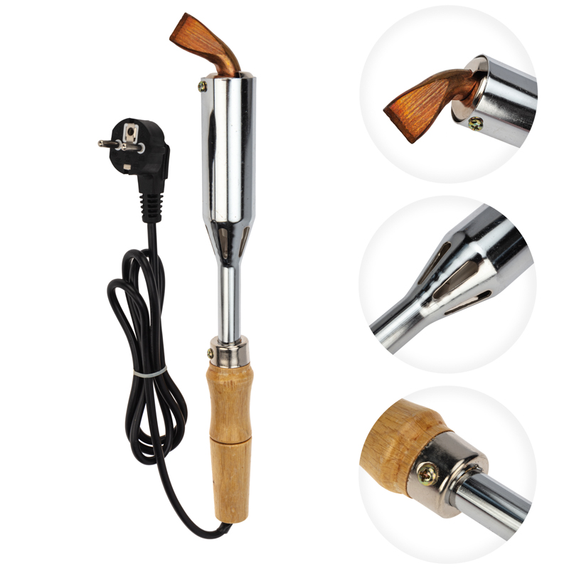 Электрический паяльник ПД 300 Вт с деревянной ручкой и клинообразным жалом непрерывного нагрева предназначен для монтажной пайки и лужения оловянно-свинцовистыми припоями элементов радиоэлектронной аппаратуры и тонкостенных металлических изделий в производственных и бытовых условиях. Перед началом эксплуатации электрического паяльника паяльное жало следует подвергнуть лужению. Напряжение питания: 230 ВМощность в установившемся режиме: 300 ВтТип нагревателя: керамическийРабочая температура паяльного стержня: 400 °CДиаметр жала паяльника: 17 ммВремя разогрева до рабочей температуры: 5-10 минДлина провода: 1.5 метра