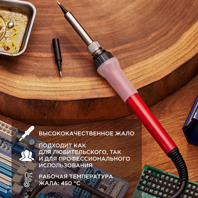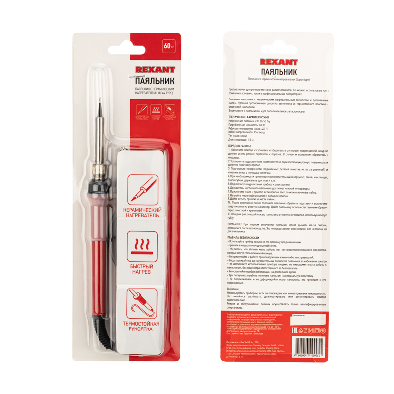 Паяльник с керамическим нагревателем 220 В/60 Вт (Japan type) REXANT предназначен для ручного монтажа радиоэлементов. Его можно использовать как в домашних условиях, так и в профессиональных лабораториях. Паяльник выполнен с керамическим нагревательным элементом и долговечным жалом. Острое тонкое жало идеально подойдет для точных работ с электронными компонентами.Сочетает в себе современный дизайн и компактный размер. Удобная эргономичная рукоятка выполнена из термостойкого пластика с резиновой накладкой, она сделает работу с инструментом легкой и приятной. В случае необходимости можно легко и быстро заменить жало паяльника.Технические характеристики:Напряжение питания: 220-230 В, 50/60 ГцПотребляемая мощность: 60 ВтРабочая температура жала: 450 ℃Время нагрева жала: 120 секундТип жала: конусДлина провода: 1.5 м