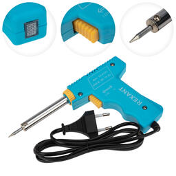 Паяльник импульсный 30-70 Вт REXANT предназначен для ручного монтажа радиоэлементов. Он используется для пайки электродеталей в двух мощностных режимах: 30 Вт и 70 Вт. Особенность данного инструмента заключается в том, что максимальная мощность и ускоренный разогрев активируются нажатием и удержанием курка. Это позволяет оператору сначала установить жало инструмента в определенную точку пайки, а затем нажатием кнопки на корпусе перевести паяльник в максимальный рабочий режим. Паяльник выполнен в форме пистолета с индикатором включения и имеет очень удобную эргономичную рукоятку из ударопрочного пластика. Характеризуется экономичным энергопотреблением. Длина провода: 1,35 мУдобен для распайки кабелей в шкафах, а также быстрых демонтажных работ.