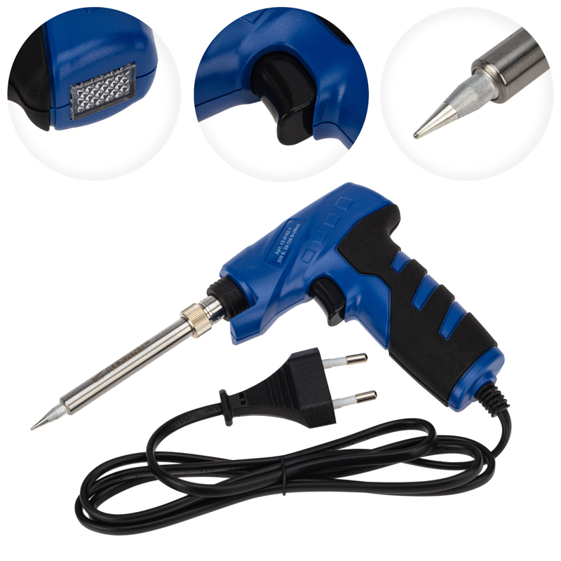 Паяльник импульсный с керамическим нагревателем (Профи) 25-130 Вт REXANT предназначен для ручного монтажа радиоэлементов. Он используется для пайки электродеталей в двух мощностных режимах: 25 и 130 Вт. Особенность данного инструмента заключается в том, что максимальная мощность и ускоренный разогрев активируются нажатием и удержанием курка. Это позволяет оператору сначала установить жало инструмента в определенную точку пайки, а затем нажатием кнопки на корпусе перевести паяльник в максимальный рабочий режим.Паяльник выполнен с керамическим нагревательным элементом и индикатором включения в форме пистолета и имеет очень удобную эргономичную рукоятку из ударопрочного пластика с резиновыми вставками. Характеризуется экономичным энергопотреблением. Длина провода: 1,35 мУдобен для распайки кабелей в шкафах, а также быстрых демонтажных работ.