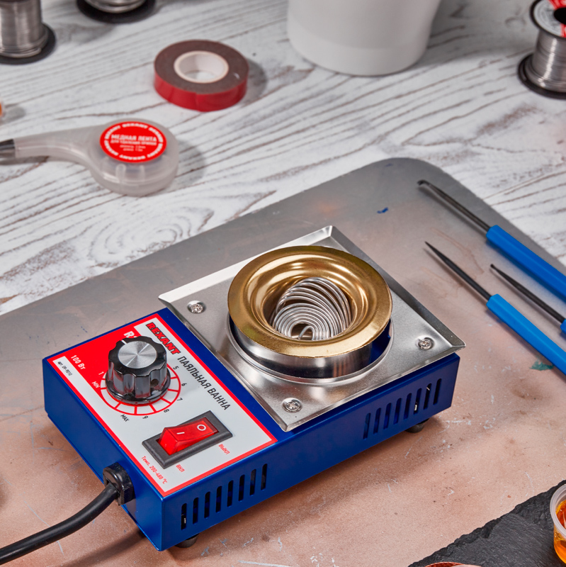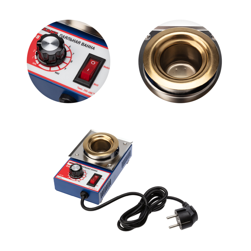 Паяльная ванна применяется для лужения проводников, кабельных наконечников в расплавленном припое. Общее описание:Улучшенное управление температурой, при котором температурный сигнал отсылается на микропроцессор. После обработки сигнал регулирует степень нагрева нагревательного элемента для точности температурного контроля. Обеспечивает нагрев в температурном диапазоне от 200...480 °С, нужная температура достигается за короткое время.Технические характеристики:Напряжение питания: 230 В/50 ГцМощность: 100 ВтРабочая температура: 200-480 °СВместимость припоя: 300 гВремя плавления: 18-20 минут до 300ºС Диаметр ванны: 38 ммКомплектация:Основной блок: 1 шт.Инструкция по эксплуатации (паспорт): 1 шт. Правила безопасности:Для предотвращения несчастных случаев и повреждения паяльной станции соблюдайте требования безопасности:1. Хранить в недоступном для детей месте.2. Ванна должна быть установлена на ровной устойчивой поверхности, исключающей наклон, опрокидывание и ее падение.3. Не располагайте ванну в местах, где расстояние до предметов и конструкций сверху менее 1 метра.4. Для обеспечения безопасности проверьте закрепление провода заземления.5. В процессе работы не оставляйте ванну разогретой до высоких температур долгое время, т. к. это может отрицательно повлиять на качество припоя и сократить срок службы паяльной ванны.6. Рабочие части устройства имеют высокую температуру. Не допускайте контакта частей тела с нагретыми частями ванны для предотвращения ожогов.7. Не допускайте контакта ванны с посторонними предметами.8. Не включайте устройство без наличия припоя в ванне.9. Недопустимо использование низкокипящих флюсов при использовании паяльной ванны. Это может привести к разбрызгиванию горячего флюса и припоя из ванны.10. Если нагрева не происходит, то убедитесь в исправности установленного предохранителя.11. Не используйте паяльную ванну при высокой температуре в течение длительного времени, т.к. это может стать причиной износа паяльной ванны и даже несчастного случая. 12. Не допускайте детей к монтажу и эксплуатации устройства.13. Не погружайте изделие в воду.14. В целях безопасной работы паяльной ванны, а также для продления срока ее службы не рекомендуется, чтобы единовременный рабочий период превышал 8 часов.15. При работе с паяльными ваннами соблюдайте меры пожарной безопасности и требования по работе с электроприборами.16. Не пользуйтесь изделием, если оно повреждено или имеет признаки неисправности. 17. Не пытайтесь разбирать, диагностировать или ремонтировать изделие самостоятельно. Ремонт и обслуживание должны осуществлять только квалифицированные специалисты! Порядок работы:1. Установите паяльную ванну на устойчивую ровную поверхность.2. Положите в паяльную ванну припой, исключая выступание частей припоя за края паяльной ванны.3. Подключите паяльную ванну к электросети.4. Включите паяльную ванну. Регулятором выставьте нужную температуру.5. При расплавлении припоя в ванне приступите к лужению, кратковременно опуская в расплавленный припой предназначенные для лужения части. 6. По окончании работы отключите ванну. Дождитесь ее полного остывания.