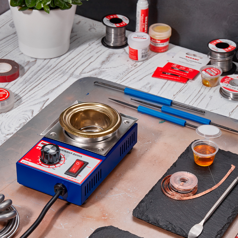 Паяльная ванна применяется для лужения проводников, кабельных наконечников в расплавленном припое. Общее описание:Улучшенное управление температурой, при котором температурный сигнал отсылается на микропроцессор. После обработки сигнал регулирует степень нагрева нагревательного элемента для точности температурного контроля. Обеспечивает нагрев в температурном диапазоне от 200...480 °С, нужная температура достигается за короткое время.Технические характеристики:Напряжение питания: 230 В/50 ГцМощность: 150 ВтРабочая температура: 200-480 °СВместимость припоя: 500 гВремя плавления: 30 минДиаметр ванны: 50 ммКомплектация:Основной блок: 1 шт.Инструкция по эксплуатации (паспорт): 1 шт. Правила безопасности:Для предотвращения несчастных случаев и повреждения паяльной станции соблюдайте требования безопасности:1. Хранить в недоступном для детей месте.2. Ванна должна быть установлена на ровной устойчивой поверхности, исключающей наклон, опрокидывание и ее падение.3. Не располагайте ванну в местах, где расстояние до предметов и конструкций сверху менее 1 метра.4. Для обеспечения безопасности проверьте закрепление провода заземления.5. В процессе работы не оставляйте ванну разогретой до высоких температур долгое время, т. к. это может отрицательно повлиять на качество припоя и сократить срок службы паяльной ванны.6. Рабочие части устройства имеют высокую температуру. Не допускайте контакта частей тела с нагретыми частями ванны для предотвращения ожогов.7. Не допускайте контакта ванны с посторонними предметами.8. Не включайте устройство без наличия припоя в ванне.9. Недопустимо использование низкокипящих флюсов при использовании паяльной ванны. Это может привести к разбрызгиванию горячего флюса и припоя из ванны.10. Если нагрева не происходит, то убедитесь в исправности установленного предохранителя.11. Не используйте паяльную ванну при высокой температуре в течение длительного времени, т.к. это может стать причиной износа паяльной ванны и даже несчастного случая. 12. Не допускайте детей к монтажу и эксплуатации устройства.13. Не погружайте изделие в воду.14. В целях безопасной работы паяльной ванны, а также для продления срока ее службы не рекомендуется, чтобы единовременный рабочий период превышал 8 часов.15. При работе с паяльными ваннами соблюдайте меры пожарной безопасности и требования по работе с электроприборами.16. Не пользуйтесь изделием, если оно повреждено или имеет признаки неисправности. 17. Не пытайтесь разбирать, диагностировать или ремонтировать изделие самостоятельно. Ремонт и обслуживание должны осуществлять только квалифицированные специалисты! Порядок работы:1. Установите паяльную ванну на устойчивую ровную поверхность.2. Положите в паяльную ванну припой, исключая выступание частей припоя за края паяльной ванны.3. Подключите паяльную ванну к электросети.4. Включите паяльную ванну. Регулятором выставьте нужную температуру.5. При расплавлении припоя в ванне приступите к лужению, кратковременно опуская в расплавленный припой предназначенные для лужения части. 6. По окончании работы отключите ванну. Дождитесь ее полного остывания.
