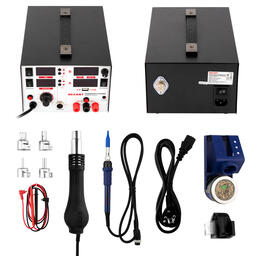 Уникальная многофункциональная паяльная станция 3 в 1 оснащена термофеном, паяльником и источником питания. Все три функции автономны и могут работать независимо друг от друга.Дополнительная опция USB разъем обеспечивает соединение станции с другим оборудованием.Паяльная станция применяется для демонтажа или пайки различных видов электронных компонентов. В основном используется для ремонта портативной электроники (мобильные телефоны, видеокамеры и пр.), бытовой техники, а также для сборочных операций в небольшом производстве.Микрокомпьютер для цифрового отображения данных и контроля температуры с точностью до 1 °C, большая мощность, быстрый разогрев. Все эти преимущества делают бессвинцовую распайку или пайку безопасной для таких чувствительных компонентов как SOIC, PLCC, QFP, BGA и т. д. Комплектация станции: основной блок, сетевой шнур, термофен, паяльник, держатель паяльника, держатель термофена, губка для очистки жала паяльника (в ложементе), 3 насадки для термофена разного размера, 1 пара проводов для БП.Технические характеристики:Напряжение питания: 220-230 В 50 Гц Потребляемая мощность: 850 Вт Тип компрессора: бесщеточный Диапазон рабочих температур термофена: 100...480 °C Воздушный поток: до 120 л/мин Диапазон рабочих температур паяльника: 200...480 °C Паяльник: 50 Вт, керамический нагреватель Блок питания, напряжение: 0-30 В Блок питания, сила тока: 0-5 А Функция автоматического режима сна: есть Длина кабеля: 1,2 м Габаритные размеры: 24 Х 18 Х 12 см Масса станции: 3,88 кг