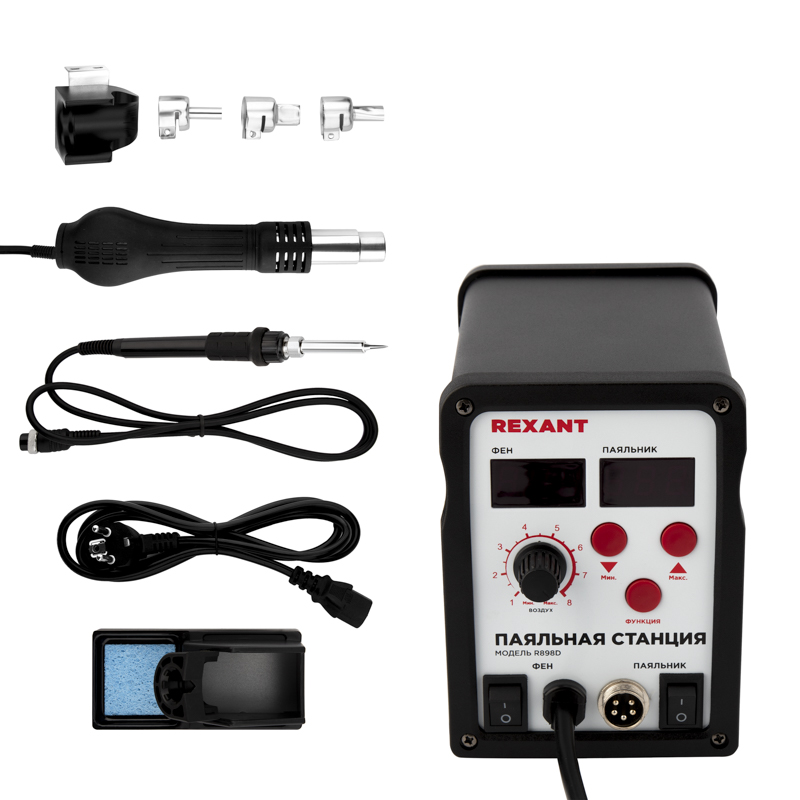 Универсальная цифровая паяльная станция 2 в 1 с компрессорным феном и паяльником (R898D).Фен и паяльник автономны и могут работать независимо друг от друга.Станция предназначена для демонтажа или пайки различных видов компонентов, таких как SOIC, PLCC, QFP, BGA и т. д.Сочетает в себе современный дизайн и компактный размер, что позволяет экономить рабочее пространство. Микрокомпьютер для цифрового отображения данных и контроля температуры с точностью до 1 °C, быстрый и равномерный разогрев, регулировка интенсивности обдува. Все эти преимущества делают бесконтактную пайку безопасной для таких чувствительных компонентов как SOIC, PLCC, QFP, BGA и т. д.После выключения устройство автоматически охлаждается. Комплектация станции: основной блок, термофен, паяльник, держатель паяльника, держатель термофена, губка для очистки жала паяльника (в ложементе), 3 насадки для термофена разного размера.Технические характеристики:Цифровое отображение температурыТип компрессора: бесщеточныйНапряжение питания: 220-230 В 50 ГцПотребляемая мощность: 750 ВтМощность паяльника: 60 ВтТемпература жала паяльника: 460℃Диаметр жала: 6 ммДлина жала: 45 ммПятно контакта жала: 0,7 ммНапряжение питания паяльника: 26 ВМощность термофена: 700 ВтТемпература воздуха фена: 480℃Напряжение питания термофена: 220 ВДлина трубки фена: 1260 ммВоздушный поток: до 120 л/минДлина кабеля: 1,2 мГабаритные размеры: 15Х9,5Х13 смМасса станции: 2.4 кг