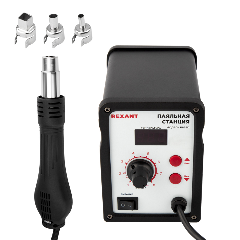 Термовоздушная паяльная станция (паяльный фен) (R858D) применяется для демонтажа или пайки различных видов компонентов таких как SOIC, PLCC, QFP, BGA и т. д.Оснащена микрокомпьютером для цифрового отображения данных и контроля температуры с точностью до 1 °C.Быстрый и равномерный разогрев, регулировка интенсивности обдува. Автоматическая продувка по окончании работы для охлаждения нагревательного элемента. Компрессор и нагревательный элемент находятся в ручке фена.Комплектация станции: основной блок, термофен, держатель термофена, 3 насадки разного размера.Технические характеристики:Цифровое отображение температурыНапряжение питания: 220-230 В 50 ГцПотребляемая мощность: 700 ВтМощность термофена: 700 ВтДиапазон рабочих температур фена: 150...500 °CДлина трубки фена: 1260 ммВоздушный поток: до 120 л/минУровень шума: меньше 45 ДбДлина кабеля: 1,2 мГабаритные размеры: 15Х9,5Х13 смМасса станции: 1.5 кг
