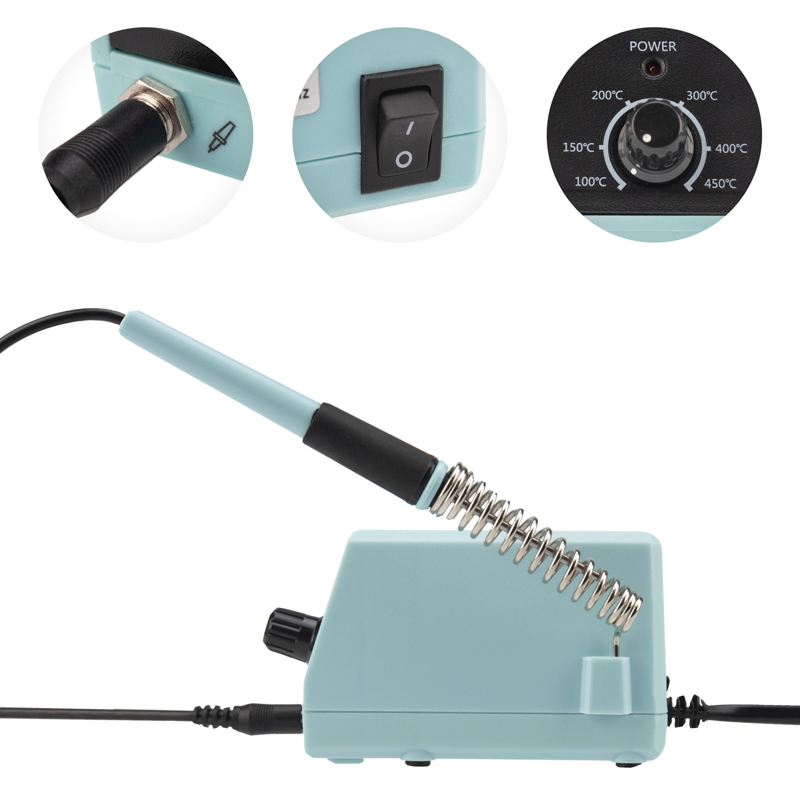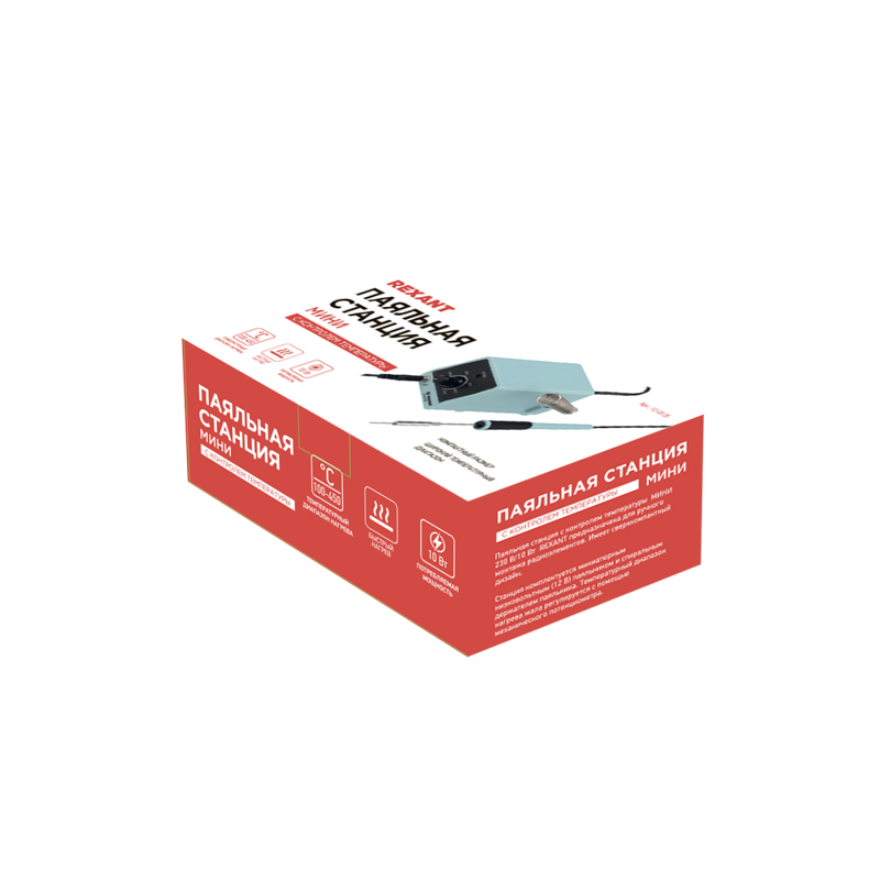 Паяльная станция с контролем температуры МИНИ 230 В/10 Вт REXANT предназначена для ручного монтажа радиоэлементов. Имеет сверхкомпактный дизайн. Её можно использовать как в домашних условиях, так и в профессиональных лабораториях. Температурный диапазон нагрева жала 100...450 °С, регулируется с помощью механического потенциометра. Станция комплектуется миниатюрным низковольтным (12 В) паяльником и спиральным держателем паяльника. Технические характеристики: Напряжение питания: 230 В 50 ГцПаяльник: 12 В/ 10 Вт, долговечное жалоДиапазон регулировки температуры жала паяльника: 100...450 °CДлина жала: 32,5 ммВнешний диаметр жала: 4,6 ммКонтактное "пятно" жала: 1 ммМасса станции: 0.75 кг