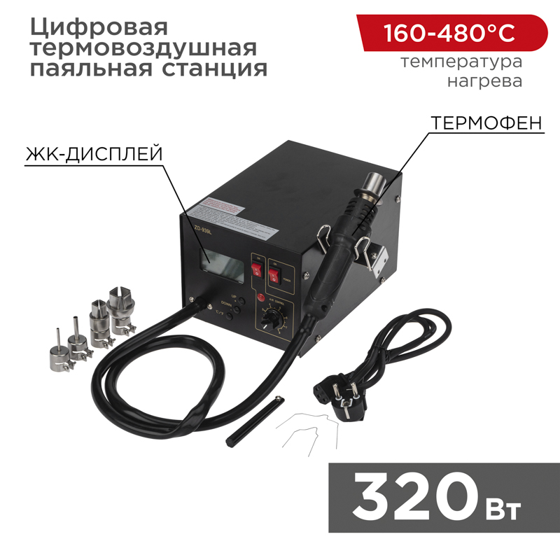 Термовоздушная паяльная станция является универсальным инструментом для пайки и ремонта современной электронной техники, позволяя работать со многими типами корпусов компонентов для поверхностного монтажа благодаря широкому выбору насадок.Технические характеристики:Напряжение питания: 220-230 В/50 ГцПотребляемая мощность: 320 ВтРегулируемый диапазон температур: +160...+480 °CРазогрев до рабочей температуры: 1.5-3 минДиаметр сопла: 21.5 ммТип дисплея: жидкокристаллическийЗащита от перегрева: даМасса: 4 кгДля удобства эксплуатации на корпусе располагается цифровой ЖК-дисплей. Температуру горячего воздуха можно регулировать в диапазоне 160...480 °C, что позволяет осуществлять как монтаж, так и демонтаж компонентов. Набор насадок позволяет работать с любыми типами корпусов для поверхностного монтажа. Автоматический режим охлаждения срабатывает после выключения станции, что обеспечивает увеличенный срок службы нагревательного элемента. Компактный дизайн позволяет экономить рабочее пространство монтажника.