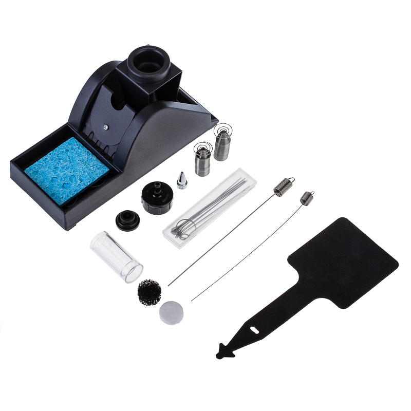 В комплектацию станции входят: основной блок, паяльник, демонтажный паяльник, держатель паяльника, губка для очистки жала паяльника (в ложементе)