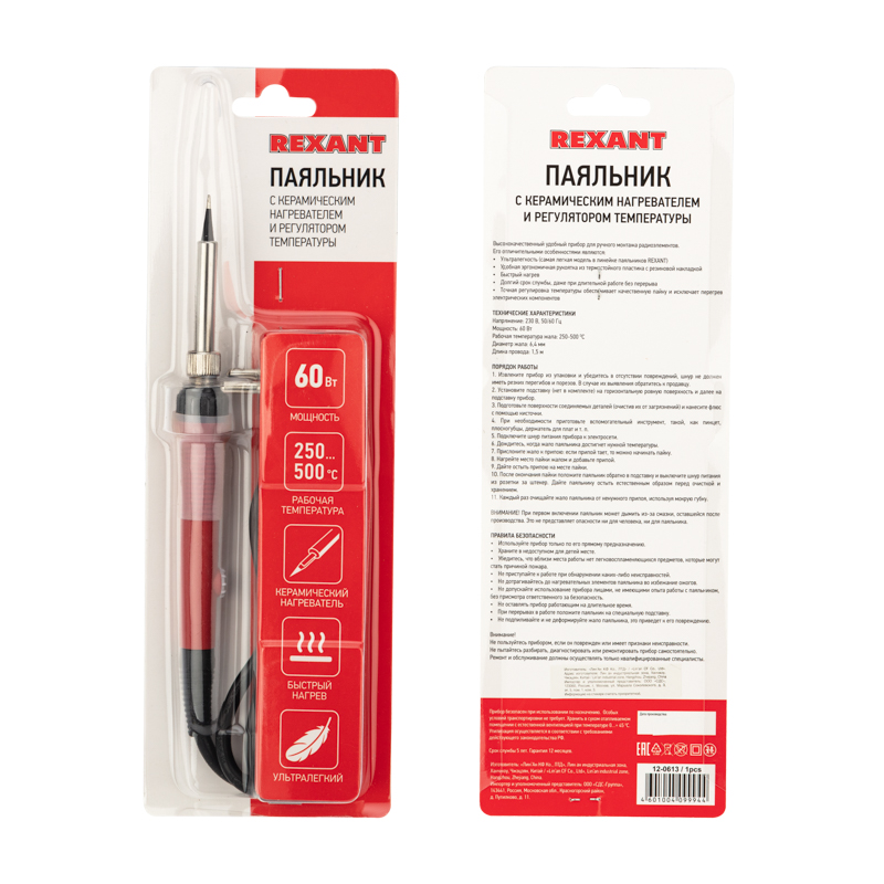 Паяльник с керамическим нагревателем и регулятором температуры 250...500 °C 220 В/60 Вт (Japan type) REXANT предназначен для ручного монтажа радиоэлементов. Его можно использовать как в домашних условиях, так и в профессиональных лабораториях. Паяльник выполнен с керамическим нагревательным элементом и долговечным жалом. В корпус встроен аналоговый регулятор температуры в диапазоне 250...500°C. Широкий диапазон рабочих температур позволяет применять данный паяльник в самых разнообразных условиях. Острое тонкое жало идеально подойдет для точных работ с электронными компонентами.Сочетает в себе современный дизайн и компактный размер. Удобная эргономичная рукоятка выполнена из термостойкого пластика с резиновой накладкой, она сделает работу с инструментом легкой и приятной. В случае необходимости можно легко и быстро заменить жало паяльника.Технические характеристики:Напряжение питания: 220-230 В, 50/60 ГцПотребляемая мощность: 60 ВтДиапазон рабочих температур: 250...500 ℃Время нагрева жала: 45 секундТип жала: конусДлина провода: 1.5 м