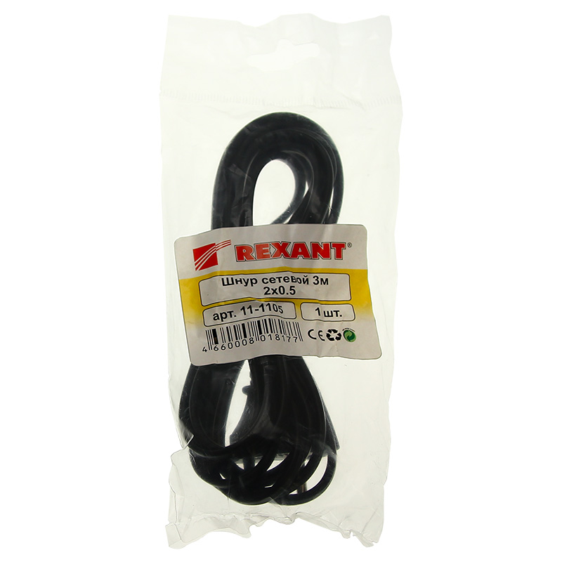 Шнур сетевой 3 м 2x0.5 мм² REXANT предназначен для подключения к сети переменного тока (AC) с напряжением 220 B аудио- и видеоаппаратуры, источников питания ноутбуков, игровых консолей и других приборов, имеющих штыревой сетевой разъем типа С8 (известен из-за его формы как «восьмерка»). Данный сетевой шнур (IEC cord) состоит из двухжильного провода с сечением жил 0.5 мм², с одной стороны литой неразборной плоской вилкой (евро) и с другой — литым гнездовым неполяризованным разъемом типа C7 (евроразъем). Основные характеристики:Тип вилки: евроТип розетки: IEC (С7)Максимальная сила тока: 2.5 АИзоляция жил и общая оболочка изготовлена из ПВХДлина провода: 3 мШнур имеет многопроволочные жилы, заключенные в эластичную двойную изоляцию из ПВХ, что делает его максимально гибким и увеличивает срок эксплуатации изделия.