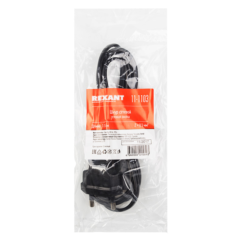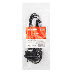 Шнур сетевой (угловая вилка) 2x0.5 мм² 1.5 м REXANT предназначен для подключения к сети переменного тока (AC) с напряжением 220 B аудио- и видеоаппаратуры, источников питания ноутбуков, игровых консолей и других приборов, имеющих штыревой сетевой разъем типа С8 (известен из-за его формы как «восьмерка»). Данный сетевой шнур (IEC cord) состоит из двухжильного провода с сечением жил 0.5 мм², с одной стороны угловой литой плоской вилки (евро) и с другой — литого гнездового неполяризованного разъема типа C7 (евроразъем). Основные характеристики:Тип вилки: евро угловаяТип розетки: IEC (С7)Максимальная сила тока: 2.5 АИзоляция жил и общая оболочка изготовлена из ПВХДлина провода: 1.5 мТакой шнур удобен при подключении электрооборудования в труднодоступных местах, либо когда подключаемое устройство нужно разместить в непосредственной близости к чему-либо. Шнур имеет многопроволочные жилы, заключенные в эластичную двойную изоляцию из ПВХ, что делает его максимально гибким и увеличивает срок эксплуатации изделия.