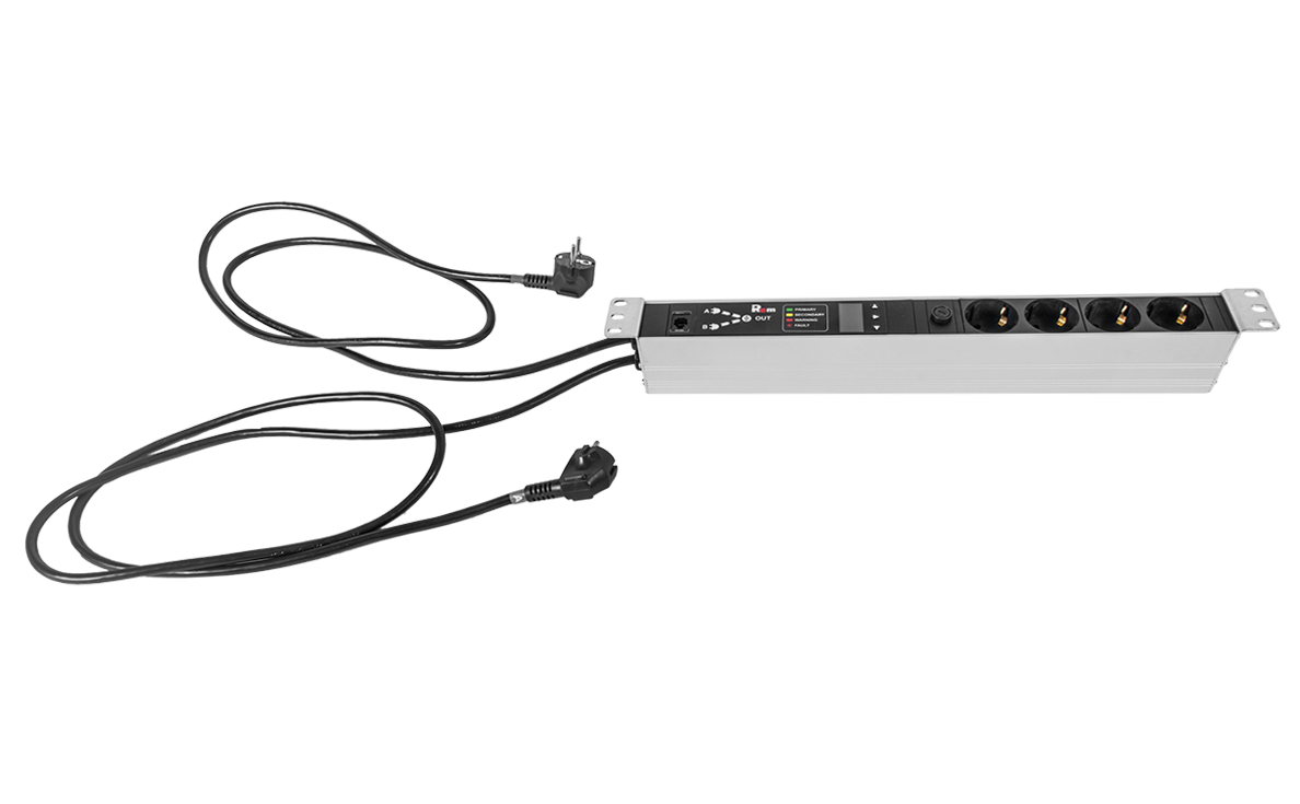 Блок розеток REM с автоматическим вводом резерва (АВР) предназначен для обеспечения бесперебойного питания электроэнергией потребителей. Имеет два ввода питания А и B от сети переменного тока, в случае потери питания на основном вводе или выходе параметров за допустимые пределы АВР REM автоматически переключает питание на резервный ввод, позволяя организовать непрерывное питание нагрузок. Момент переключения с одного ввода на другой не нарушает работу подключенного оборудования, поскольку переключение производится в течение короткого промежутка времени. В качестве приоритетного может быть настроен любой из вводов А или В, либо может быть установлен режим AUTO. В режиме AUTO ввод, используемый в настоящий момент, считается приоритетным. Настройка и управление осуществляются локально через встроенный OLED-дисплей или через интерфейс RS-485 по протоколу Modbus-RTU, а также удалённо при подключении АВР REM к PDU R-2MC. АВР можно настроить для работы: • с источниками бесперебойного питания (ИБП) с выходным напряжением в форме модифицированной синусоиды (трапеции); • с ИБП со схемой bypass, кратковременно прерывающей выходное питание при переходе на батарею. Стандартные варианты применения: • ввод A трансформаторная линия – ввод B генераторная линия; • ввод A трансформаторная линия – ввод B трансформаторная линия. АВР REM может применяться для подключения IT-оборудования с одним блоком питания к двум независимым вводам питания. Если основной ввод питания подключён к ИБП, а резервный к трансформаторной линии, АВР применим для аварийного или сервисного байпас-ИБП. Страница технической поддержки находится по ссылке.