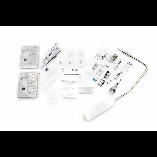 Комплект поставкиверхний транспортер, держатели бобин - 9 шт., диск (Designer Diamond), игольная пластина для прямой строчки, инструкция на русском языке, коленный рычаг, лапка – рубильник, лапка (универсальная), лапка для автоматической петли R, лапка для втачивания молнии Е, лапка для декоративной строчки, лапка для подрубки, лапка для пришивания пуговиц, лапка для прямых строчек, лапка стандартная, мягкий чехол, набор игл, направитель для квилтинга, оверлочная лапка, отвертка, педаль, планка нитенаправителей, планшет, подставка под катушки, распарыватель, расширительный столик, сетка для катушки, сетка для катушки (2 шт.), фиксатор катушки, шнур питания, шпули, щеточка