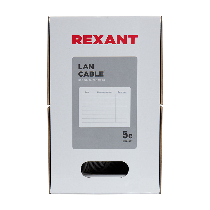 Кабель UTP 4PR 24AWG, CAT5e, нг(А)-HF (бухта 305 м) REXANT. Неэкранированная витая пара, материал проводника высокоочищенная бескислородная медь, калибр (24 AWG). Материал оболочки — нг(А)-HF, огнестойкий, не распространяющий горение при групповой прокладке, безгалогенный композит, пониженной пожарной опасности с низкой коррозионной активностью продуктов горения и тления. Кабель применяется для одиночной или групповой прокладки (с учетом объема горючей загрузки) цепей питания электроприемников систем противопожарной защиты, операционных и реанимационно-анестезионного оборудования больниц и стационаров, в местах большого количества скопления людей (больницы, школы, сады, торговые центры, аэропорты, вокзалы, метро), а также в других важных системах жизнеобеспечения, которые должны сохранять работоспособность в условиях пожара.Область применения кабеля: - Локальные сети общего назначения.- Домашние сети.- Сети малого бизнеса.- Компьютерные сети.- Сети передачи данных.- Телефония.- Цифровое телевидение.- Системы видеонаблюдения (IP-камеры).- Системы охраны и контроля доступа.- Узкоспециализированные сети (торговое оборудование, складские сети, производственные сети с использованием нестандартного периферийного оборудования, такого как станки, вариаторы, типографские машины).Кабель витая пара соединяет и передает сигнал между компьютерами, компьютерами и сервером.Сертификаты:Кабель сертифицирован по Российским стандартам.Использование кабеля регламентирует сертификат соответствия Таможенного Союза (EAC).Кабель витая пара полностью соответствует требованиям стандарта ANSI/TIA/EIA-568-B.2 и международному стандарту ISO/IEC 11801 в редакции 2002 года (издание 2).Техническое описание:Кабель имеет 8 (восемь жил), четыре пары (4PR)Материал проводника: высокоочищенная бескислородная медь, калибр 24AWGИзоляция проводника: полиэтилен повышенной плотности (HDPE), диаметром 0,9 ммЭкранирование UTP: без экранаВнешняя изоляция HF, толщина 0,5 ммОбщий диаметр кабеля: 5,4 ммРадиус изгиба кабеля минимально выдерживает 8 (восемь) внешних диаметров кабеляЧастотный диапазон: 1-100 МГцРабочая температура: –60...+60 °C, прокладка и монтаж кабелей должны производиться при температуре не ниже –10 °СУпаковка: бухта 305 м/в коробке две бухтыСрок службы: 25 лет